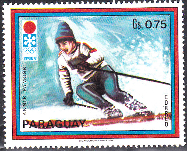 Eine Marke aus der Serie Paraguays zu den Winterspielen 1972 (MiNr 2271) zeigt Annie Famose im Markenbild.