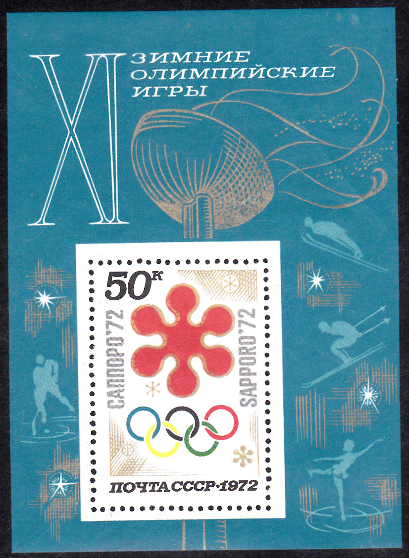 In der Sowjetunion erschien dieser Block (MiNr Block 54 mit Marke 3984) mit einem Teil des Emblems der Spiele in Sapporo und die Olympischen Ringe. Auf dem Blockrand sieht man auch das Olympische Feuer und klein ein paar Wintersportarten.