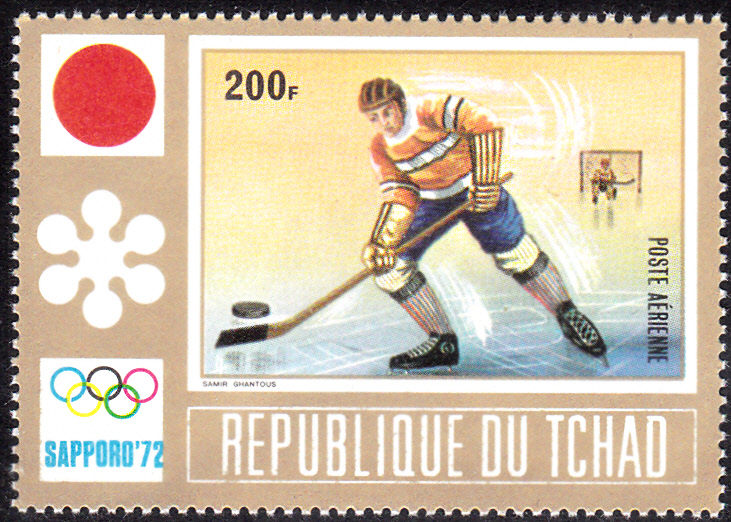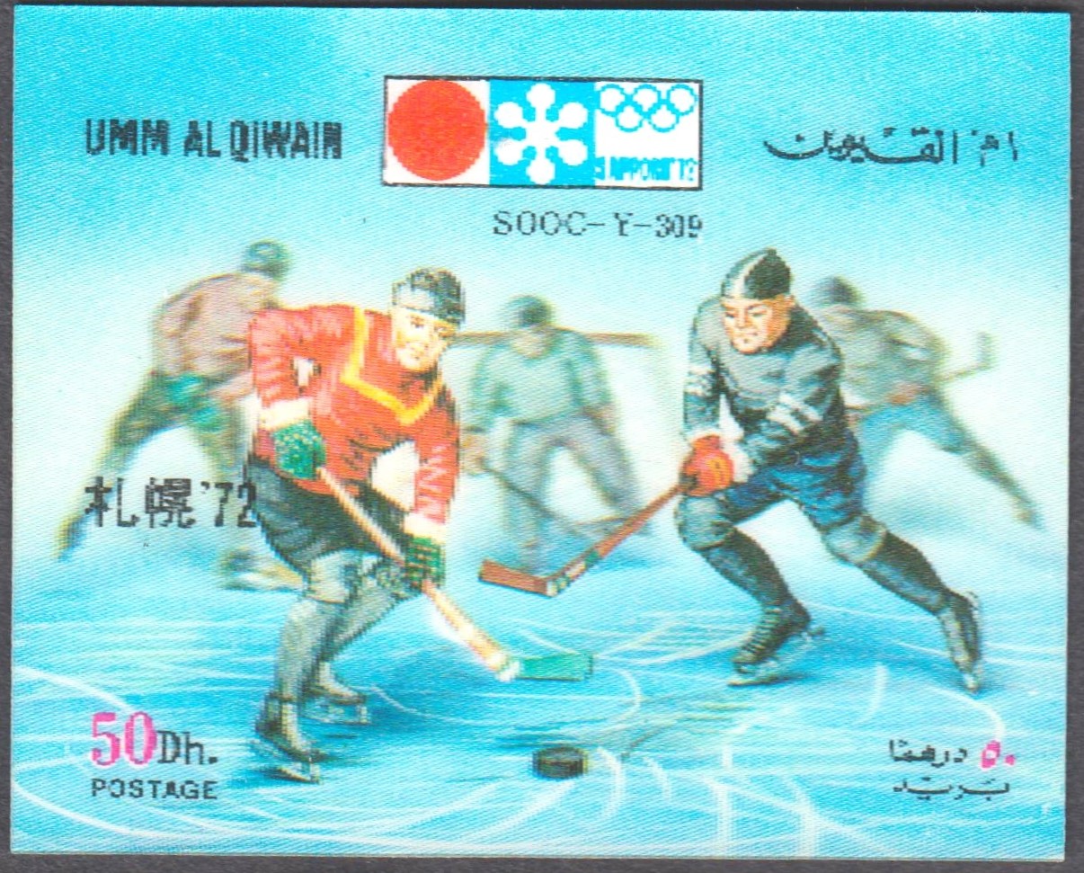 Hier Block 110 A aus Ras al-Khaima mit einem Eishockeyspieler als Nebenmotiv neben dem Hauptmotiv, einer Schneerose, eine Pflanzenart aus der Gattung Nieswurz (= Helleborus) in der Familie der Hahnenfußgewächse (Ranunculaceae):