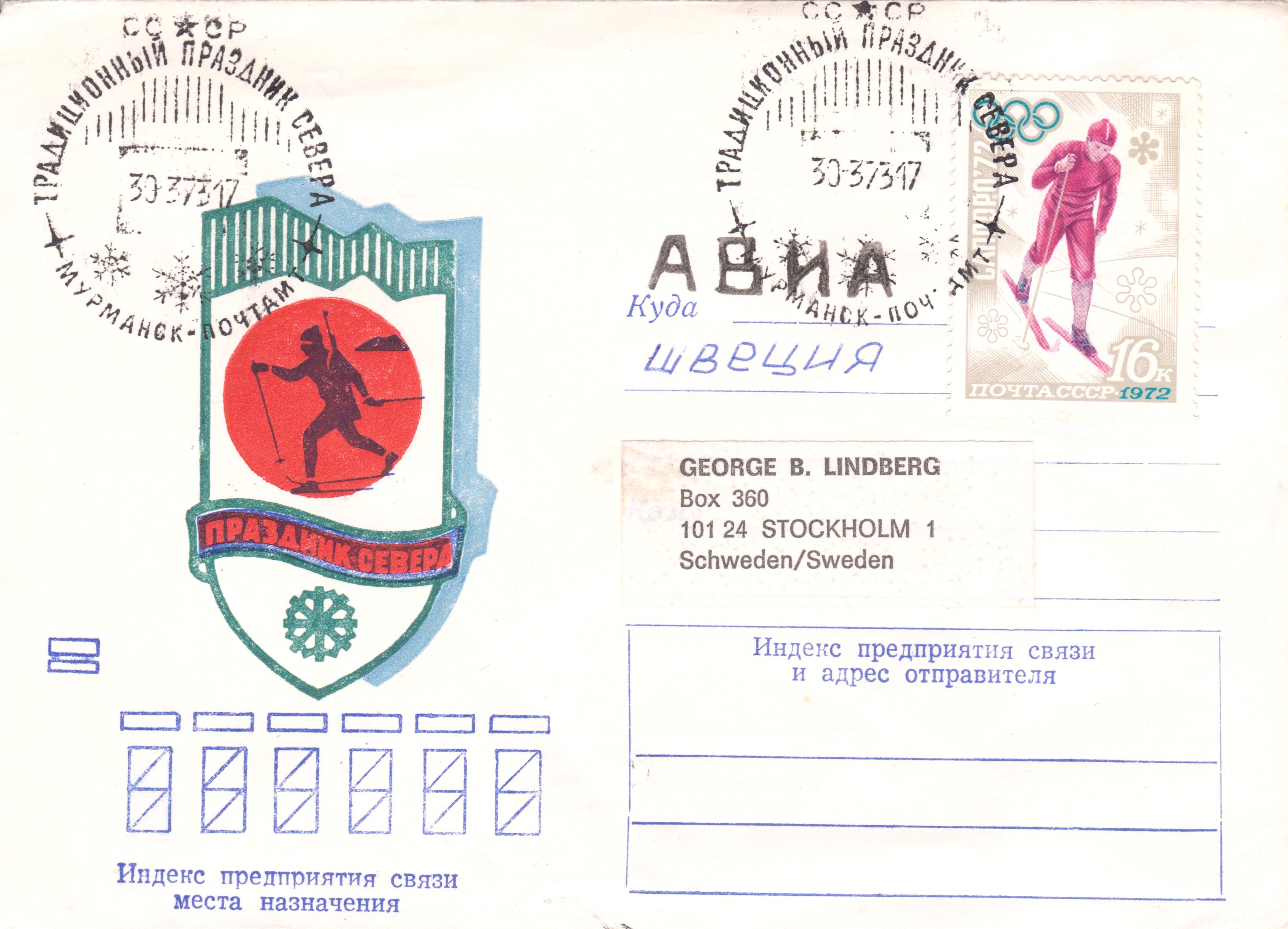 In der Sowjetunion erschien in einer Serie zu den Winterspielen 1972 diese Marke, MiNr. 3983, mit der Abbildung eines Skilangläufers, hier am 30.03.1973 auf einem echt gelaufenen Brief nach Schweden: