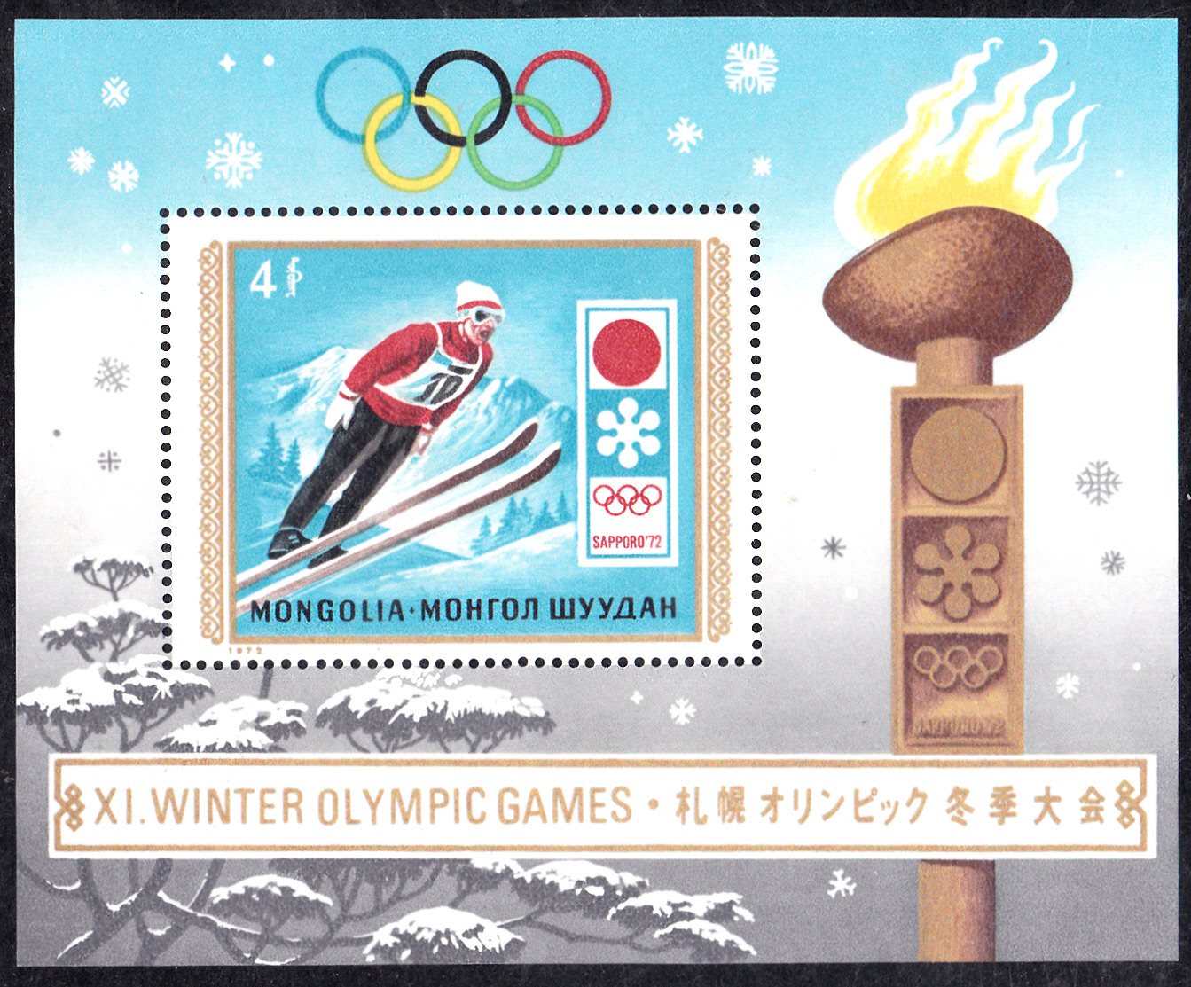 In der Mongolei ist zu den Winterspielen 1972 auch ein Block (MiNr Block 26 mit Marke MiNr 675) erschienen. Die Marke zeigt einen Skispringer.