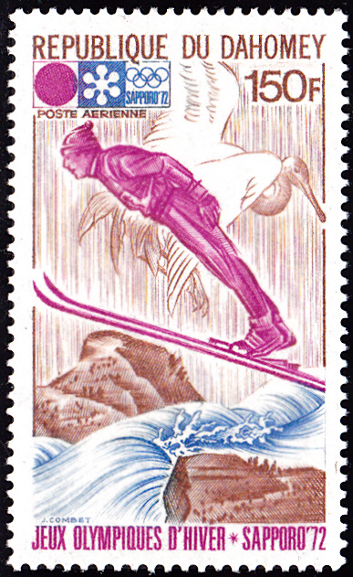 Auf dieser Marke aus Dahomey (MiNr 471) zu den Winterspielen wird ein Skispringer gezeigt, der zusammen mit einem Kranich fliegt.