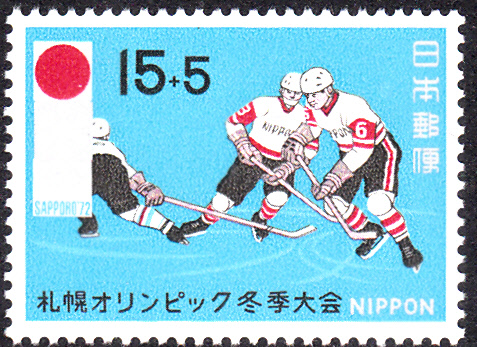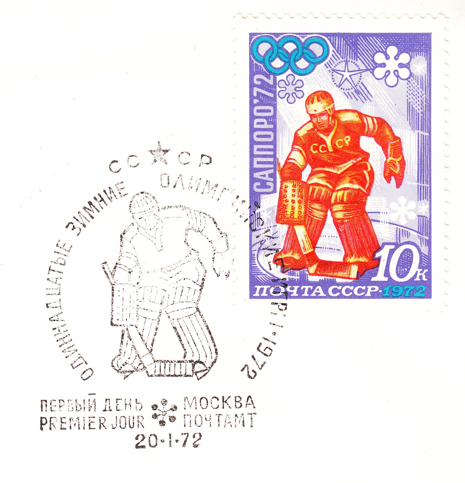 Dieses zu den Olympischen Winterspielen 1972 in Sapporo erschienene Postwertzeichen aus der Sowjetunion sowie der perfekt passende ESST zeigen einen Torwart: