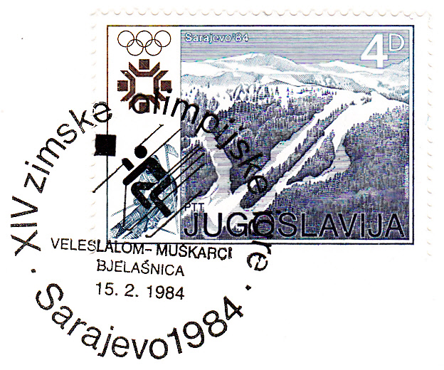 Sonderstempel vom 9.2.1984 zum Abfahrtslauf der Herren. Dieser sollte ursprünglich auch am 9.2.1984 stattfinden. Das Rennen war dann witterungsbedingt vorerst vom 9. Februar auf 12. Februar und letztlich auf den 16. Februar verschoben worden und fand am selben Tag wie die Damen-Abfahrt statt.