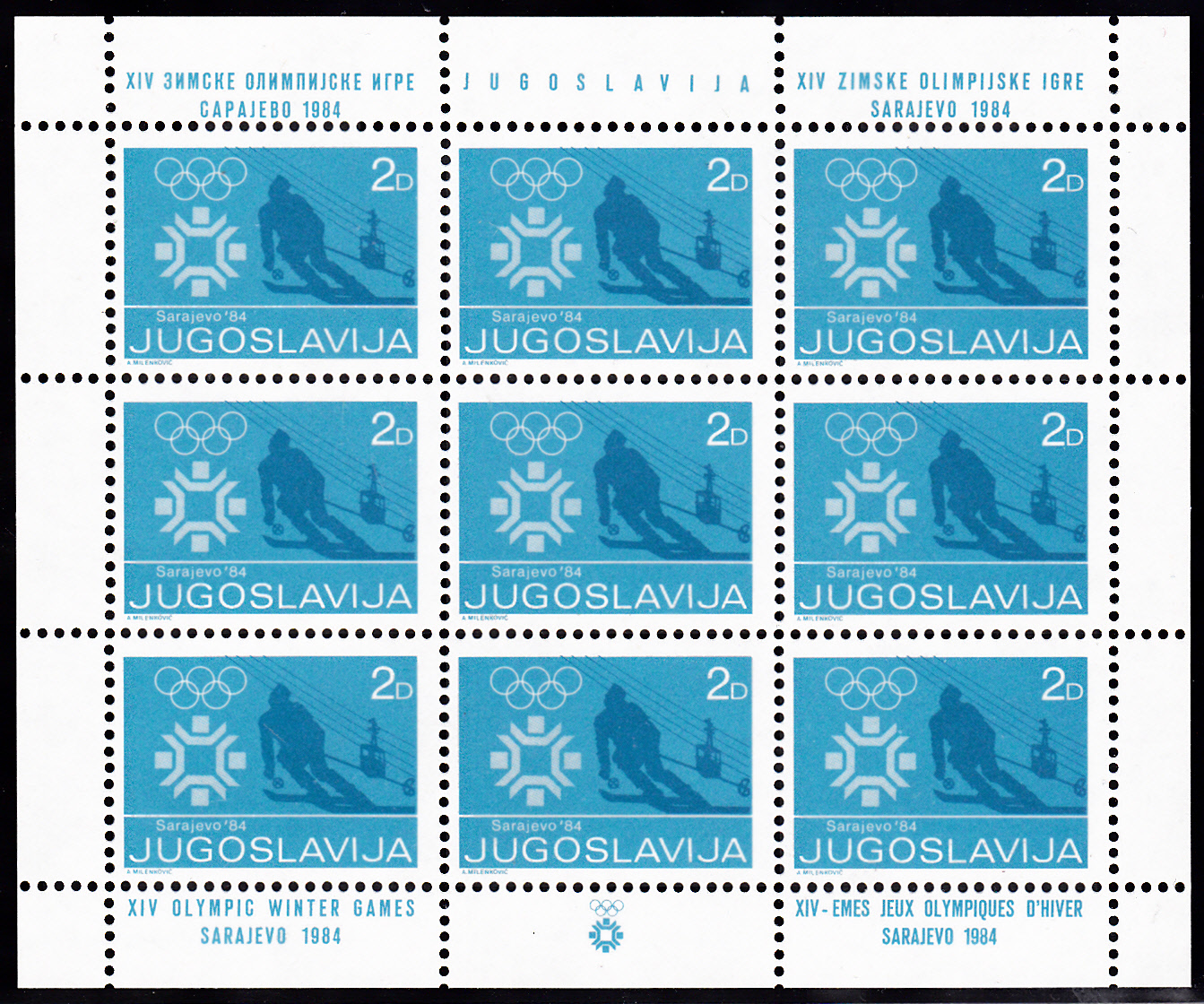 Zu den Olympischen Winterspielen in Sarajewo gab es in Jugoslawien auch eine Zwangszuschlagsmarke zu 2 Din (MiNr 83). Sie musste von 20.10. bis 20.11.1983 und von 20.1. bis 20.2.1984 verwendet werden. Sie zeigt das Emblem der Spiele, einen Skiläufer und eine Seilbahn.
