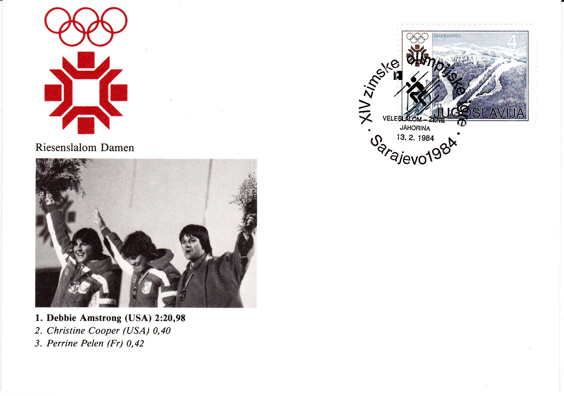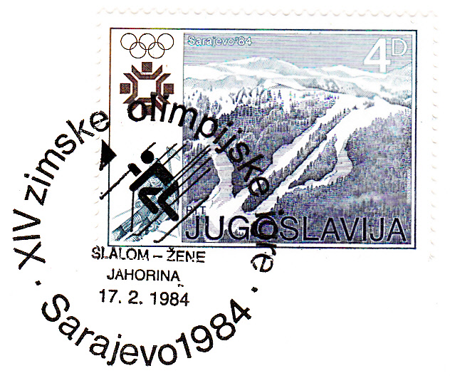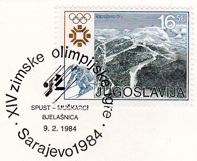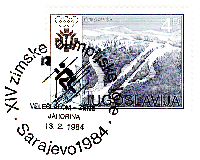 Der Sonderstempel zum Abfahrtslauf der Damen aus Sarajewo ist bildgleich mit dem Sonderstempel zum Abfahrtslauf der Herren, er unterscheidet sich nur durch die Inschrift unterhalb des Bildes. Die Damenabfahrt fand am 16.2.1984 statt. Der gezeigte Stempel stammt vom 11.2.1984.