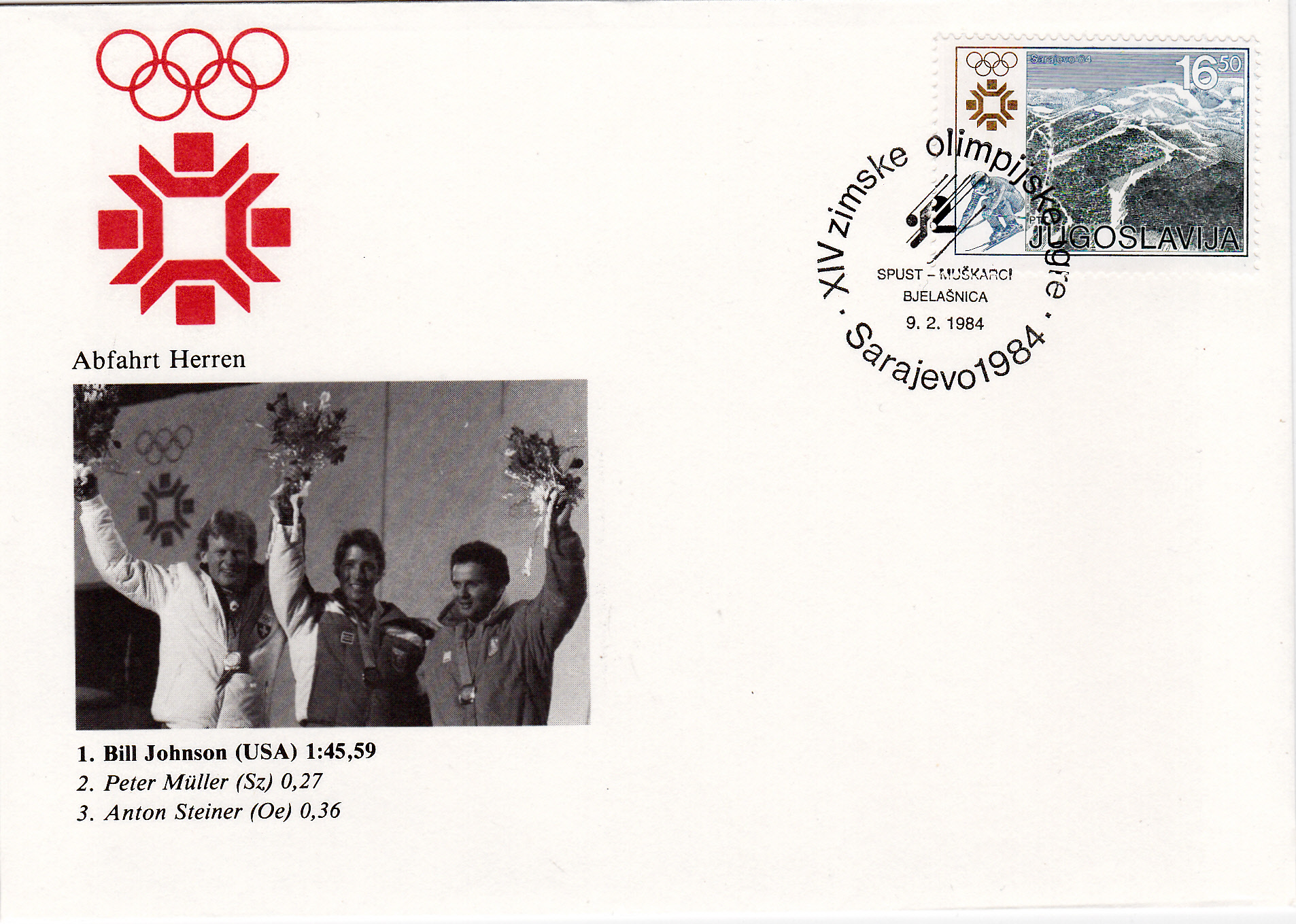 Sonderstempel vom 9.2.1984 zum Abfahrtslauf der Herren. Dieser sollte ursprünglich auch am 9.2.1984 stattfinden. Das Rennen war dann witterungsbedingt vorerst vom 9. Februar auf 12. Februar und letztlich auf den 16. Februar verschoben worden und fand am selben Tag wie die Damen-Abfahrt statt.