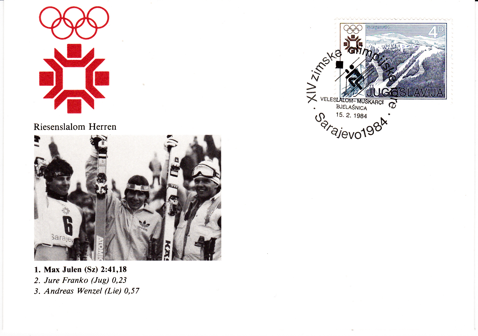 Sonderstempel vom 15.2.1984 aus Sarajewo zum Riesenslalom der Herren. Im Stempelbild das gleiche Piktogramm wie beim Stempel für den Riesenslalom der Damen.