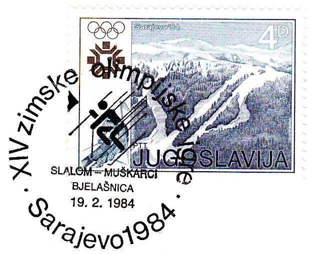 Sonderstempel vom 19.2.1984 aus Sarajewo zum Slalom der Herren am gleichen Tag. Im Stempelbild das gleiche Piktogramm wie bei den Sonderstempel zum Riesenslalom.