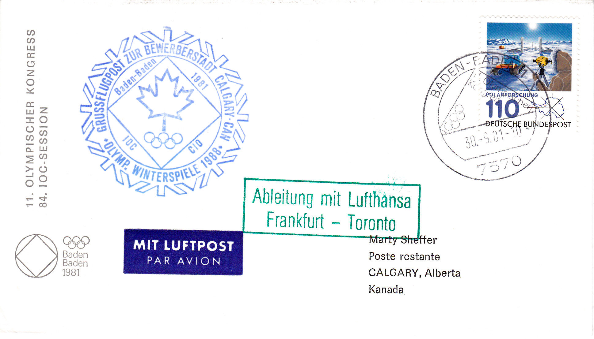 Sonderstempel vom 30.9.1981 aus Baden-Baden auf einem Brief als Grußpostflugpost nach Cortina d'Ampezzo. Das Porto betrug wie bei einem Inlandsbrief in die Cept-Länder 60Pf und es war kein Luftpostzuschlag erforderlich. Rückseitig ist ein Ankunftsstempel vom 3.10.1981.
