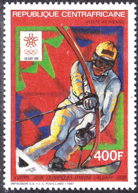 Zur Ausgabe der Zentralafrikanischen Republik gehört auch ein Block (MiNr Block 421 A mit Marke MiNr 1292 A). Auf der Marke wird ein Abfahrtsläufer gezeigt.