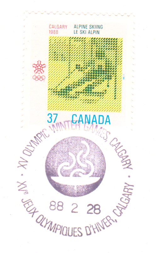 Am 12. Febr.1988 erschienen in Kanada weitere Marken zu den Olympischen Winterspiele in Calgary . Hier die beiden Marken mit den Abbildungen Riesenslalom (MiNr 1075) und Curling (MiNr 1076). Sie wurden schachbrettartig zusammengedruckt.