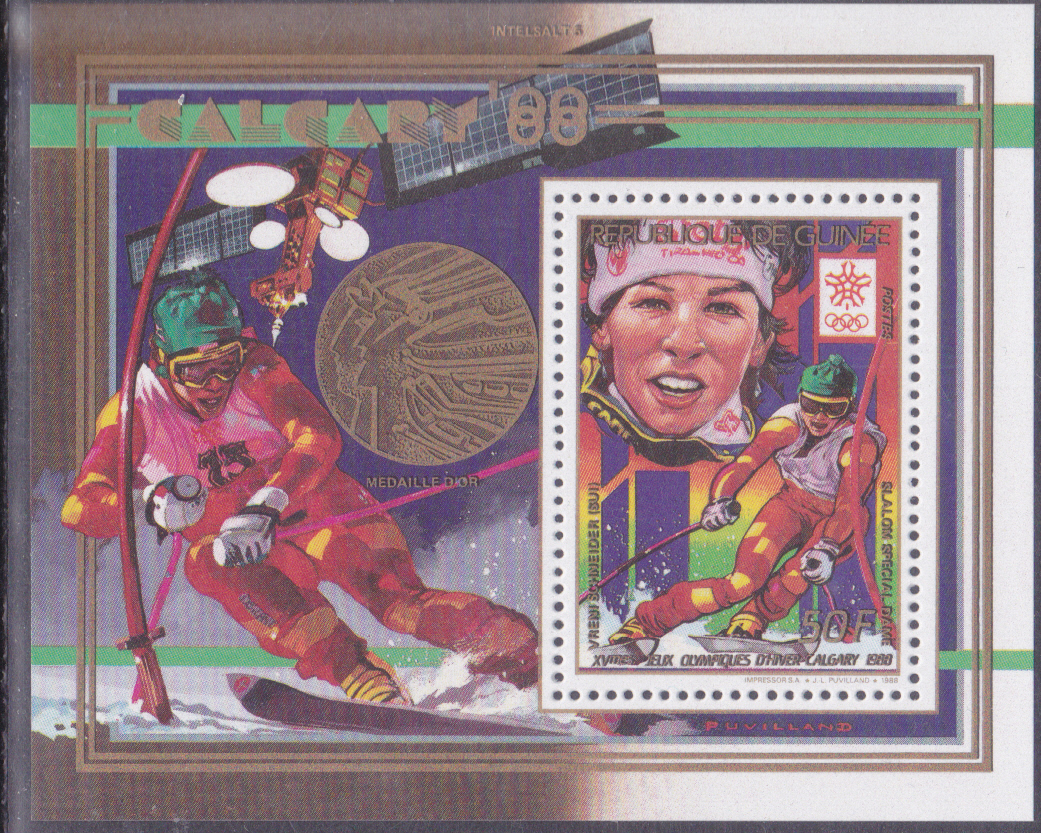 Hier zeige ich den Block (MiNr Block 320 A) mit der Marke aus Guinea (MiNr 1222 A) mit Vreni Schneider beim Slalom.