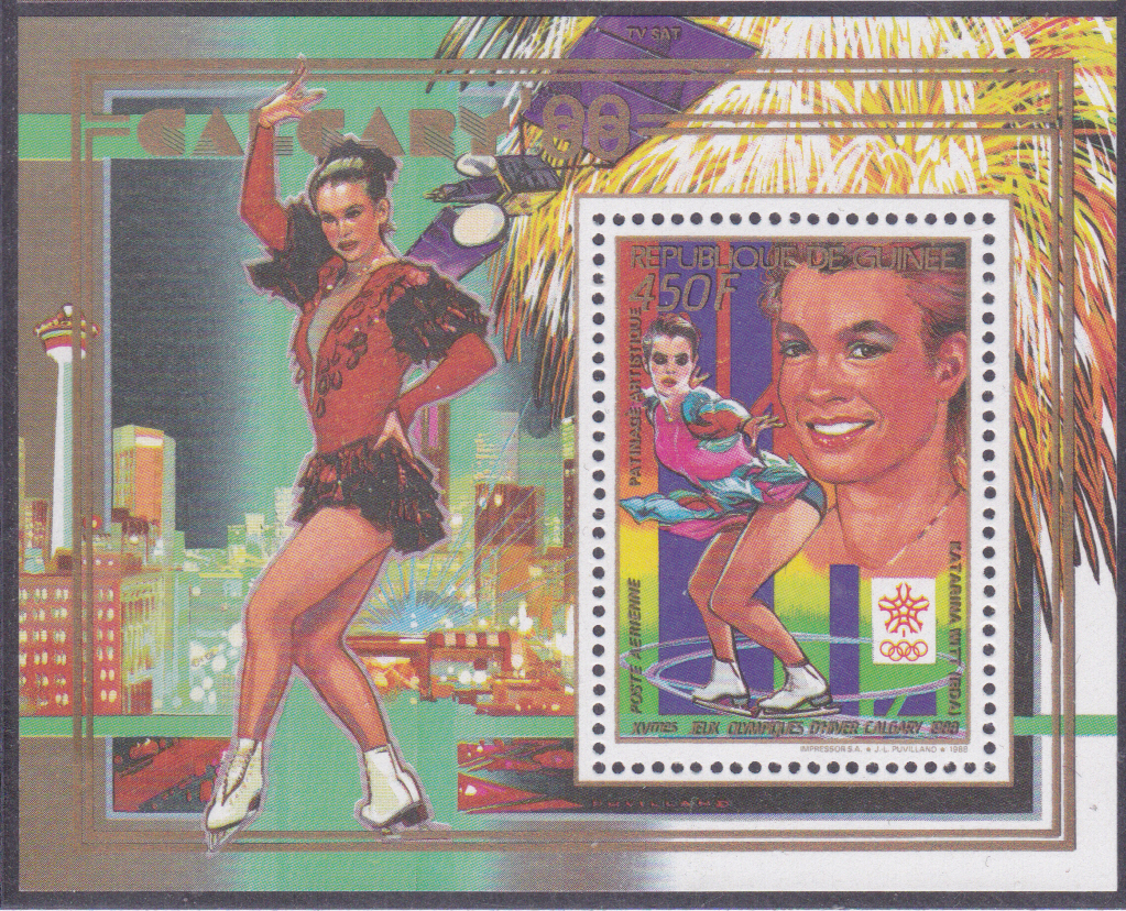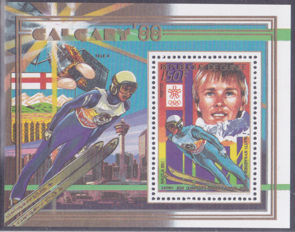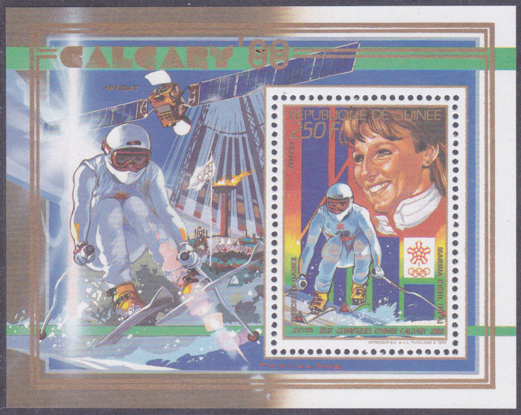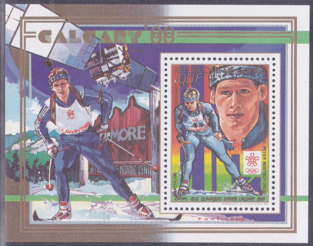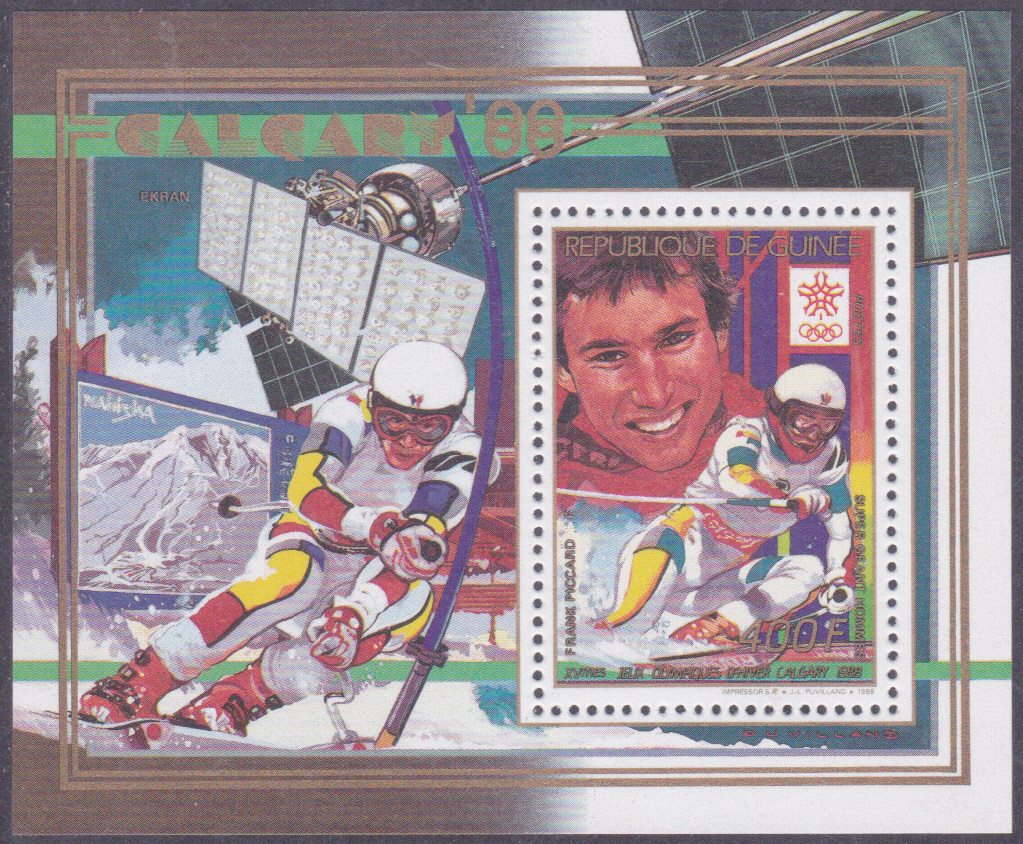 Die Marke aus Guinea (MiNr 1225 A) mit Franck Piccard wurde auch in diesem Block (MiNr Block 323 A) gedruckt.
