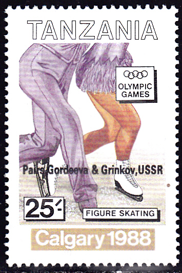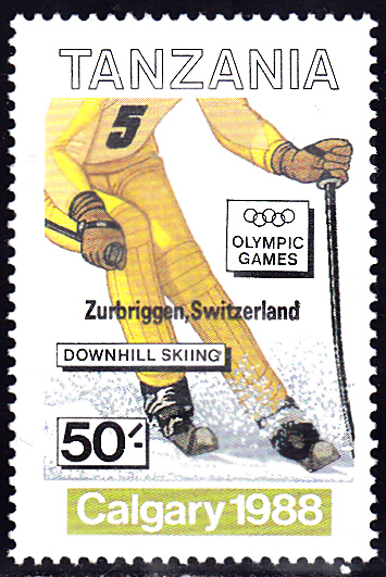 Zum Olympiasieg 1988 von dem bereits hier erwähnten Pirmin Zurbrüggen beim Abfahrtslauf ist in Tansania diese Marke (MiNr 601) mit Aufdruck erschienen.