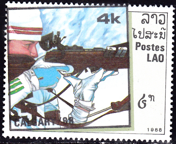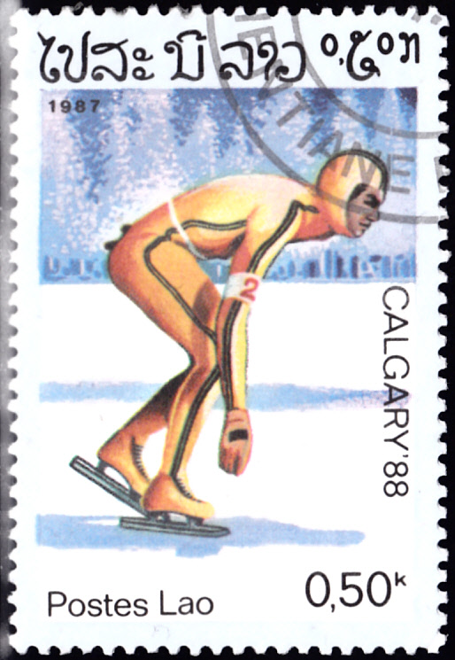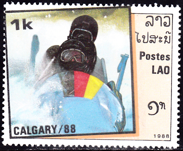 In Kambodscha gab es auch Ausgaben zu den Olympischen Winterspiele in Calgary. Hier ein Block (MiNr Block 156 mit Marke MiNr 918) mit der Abbildung eines Viererbobs.