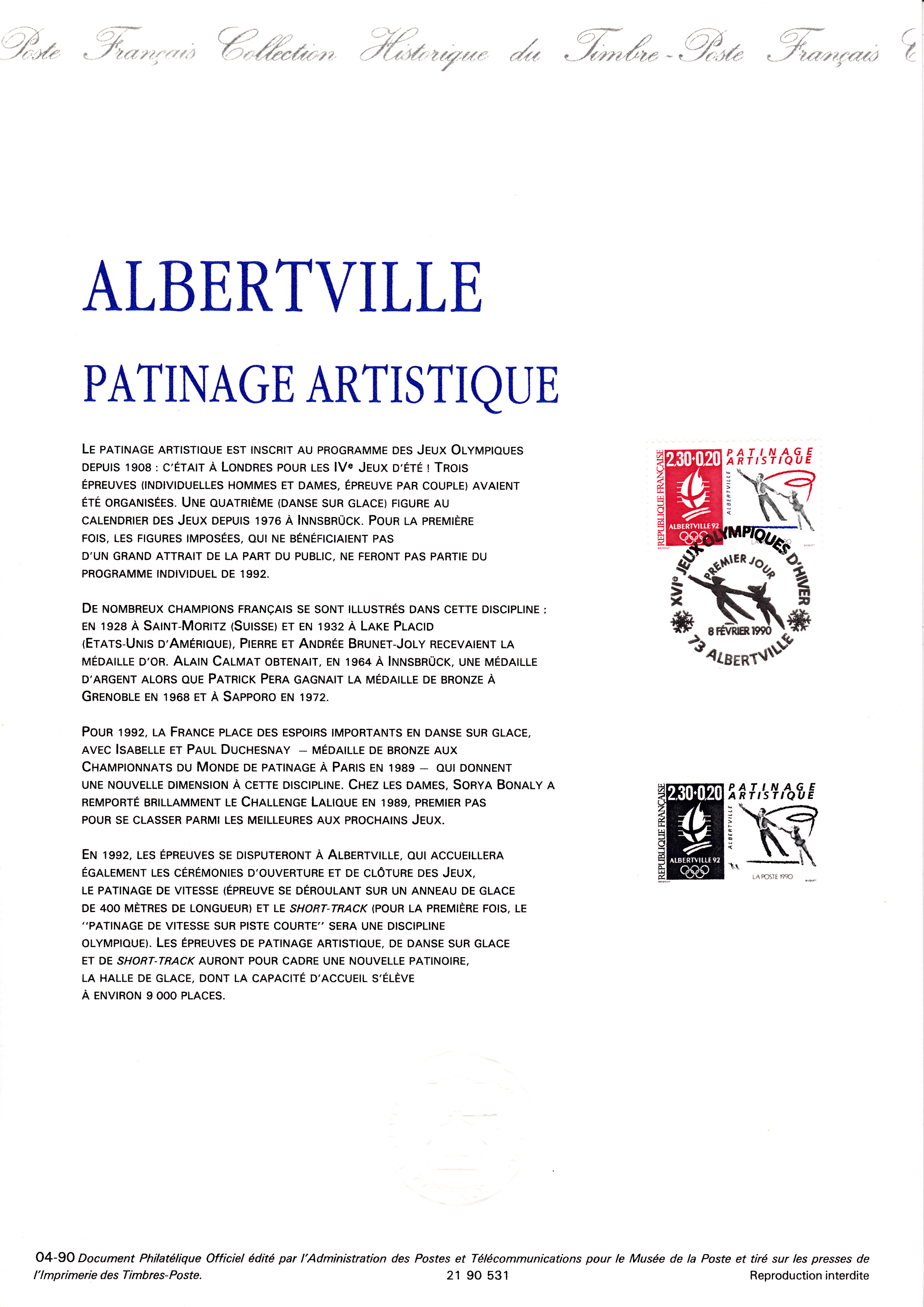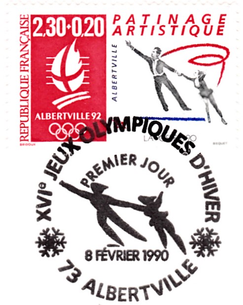 Hier zeige ich ein "Philatelistisches Dokument" (Document Philatelie Officiel), das von der Briefmarkendruckerei in Boulazac (nähe Perigeux) für die französische Post hergestellt und verkauft wurde. Es enthält die bereits gezeigte Marke mit der Abbildung "Eiskunstlauf", die mit dem Ersttagsonderstempel aus Albertville gestempelt wurden. Außerdem ist das Motiv der Marke auch noch rechts auf dem "Dokument" einfarbig eingedruckt.