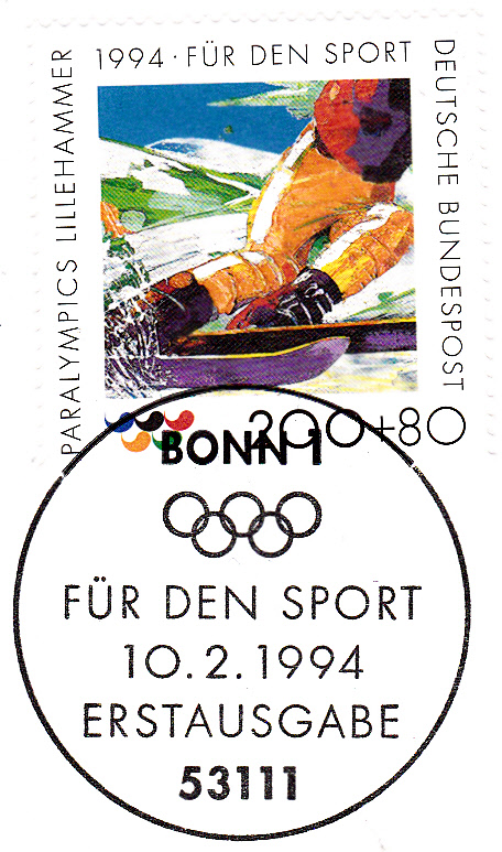 Die hier gezeigte Marke der Deutschen Bundespost aus der Serie "Für den Sport" (MiNr 1720) für die Paralympics 1994 wurde auf diesem Brief mit Einschreiben zusammen mit den anderen drei Werten der Serie als Frankatur benutzt und mit dem Ersttagstempel entwertet. Der Satzbrief ist 30Pf überfrankiert.