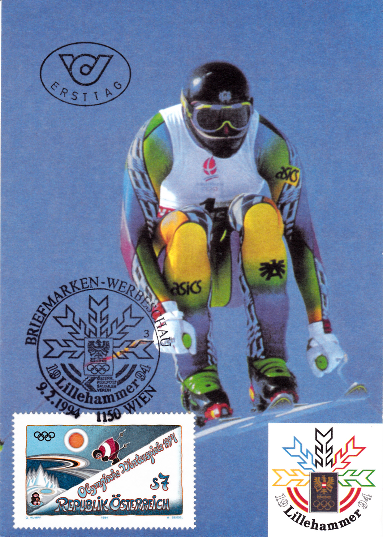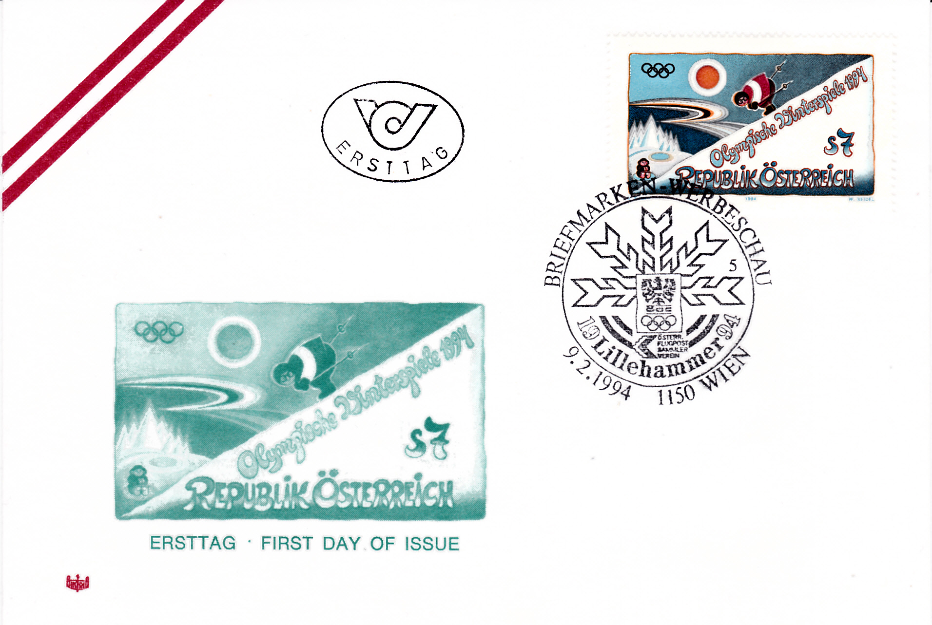 Die Marke zu den Winterspielen 1994 aus Österreich wurde auf diesem FDC mit einem thematisch passenden Sonderstempel aus Wien mit der Kennziffer "5" gestempelt. Er ist leider nicht gelaufen.