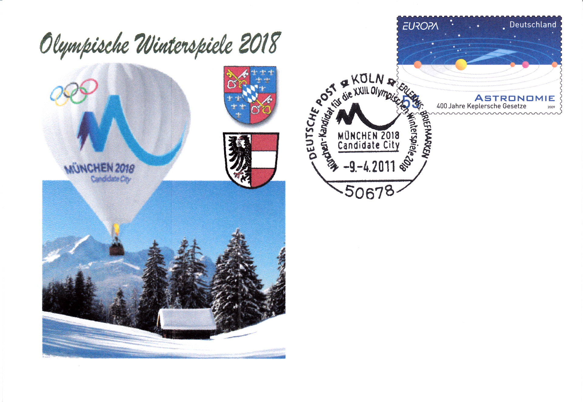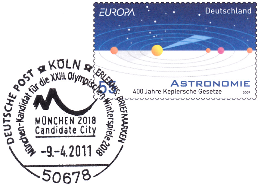 Dieser Sonderstempel aus Köln vom 9.4.2011 dokumentiert die Bewerbung von München. Der Stempel ist auf einem Plusbrief (MiNr USo 217) mit einem Zudruck zur Kandidatur von München als Veranstaltungsort für die Olympischen Winterspiele 2018 abgeschlagen.