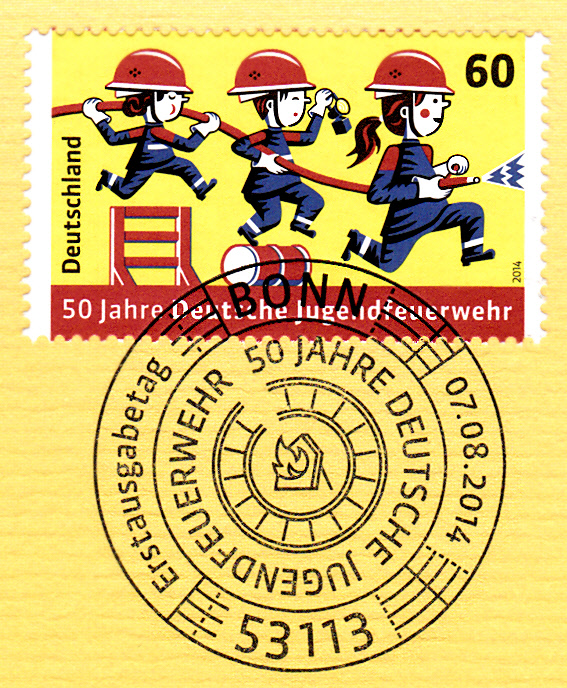 Marke "50 Jahre Deutsche Jugendfeuerwehr" der Deutschen Post AG (MiNr 3099) mit dem Ersttagsonderstempel Bonn vom 7.8.2014.