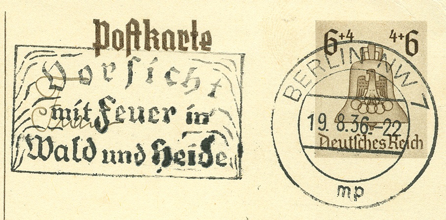 Der Werbeeinsatz "Vorsicht mit Feuer in Wald und Heide" wurde in vielen Maschinenstempel und über eine längeren Zeitraum eingesetzt. Hier ein Stempel aus Berlin C2 Kennbuchstaben "db" vom 9.8.1935.