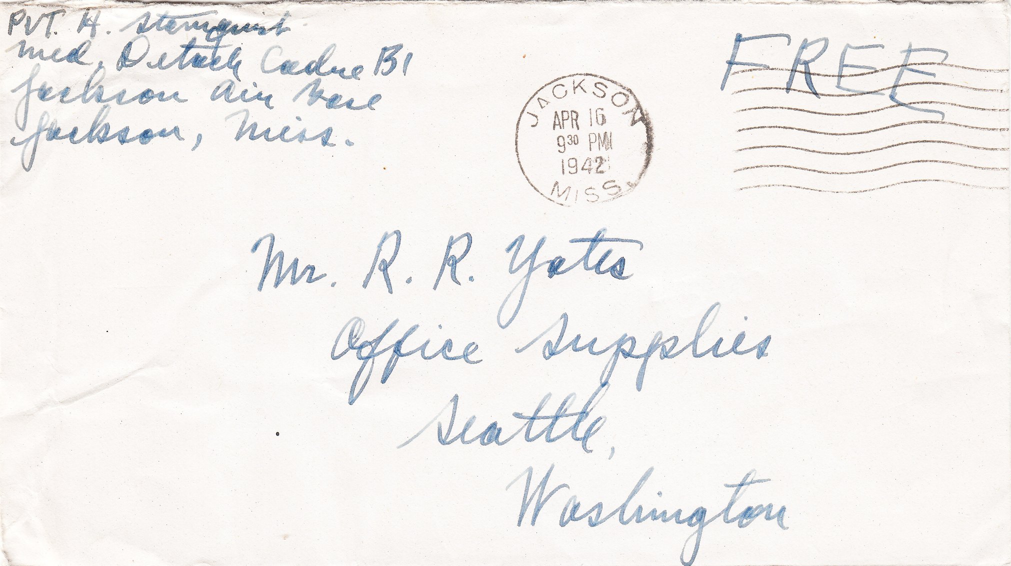 Hier ein portofreier Beleg eines Soldaten = Private = PVT der medizinischen Einheit auf dem Flugplatz vom 16.04.1942: