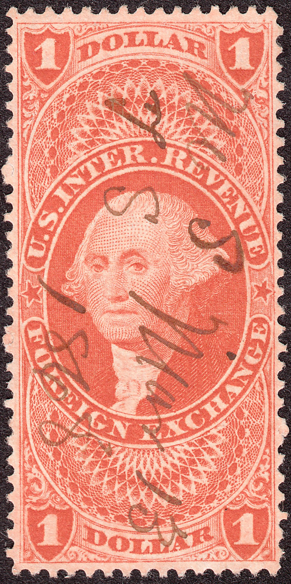 Die Wertstufe zu 1 Dollar in rot mit der Inschrift "FOREIGN EXCHANGE" katalogisiert Scott als Hauptnummer "R68", die gezähnte Version als "c":