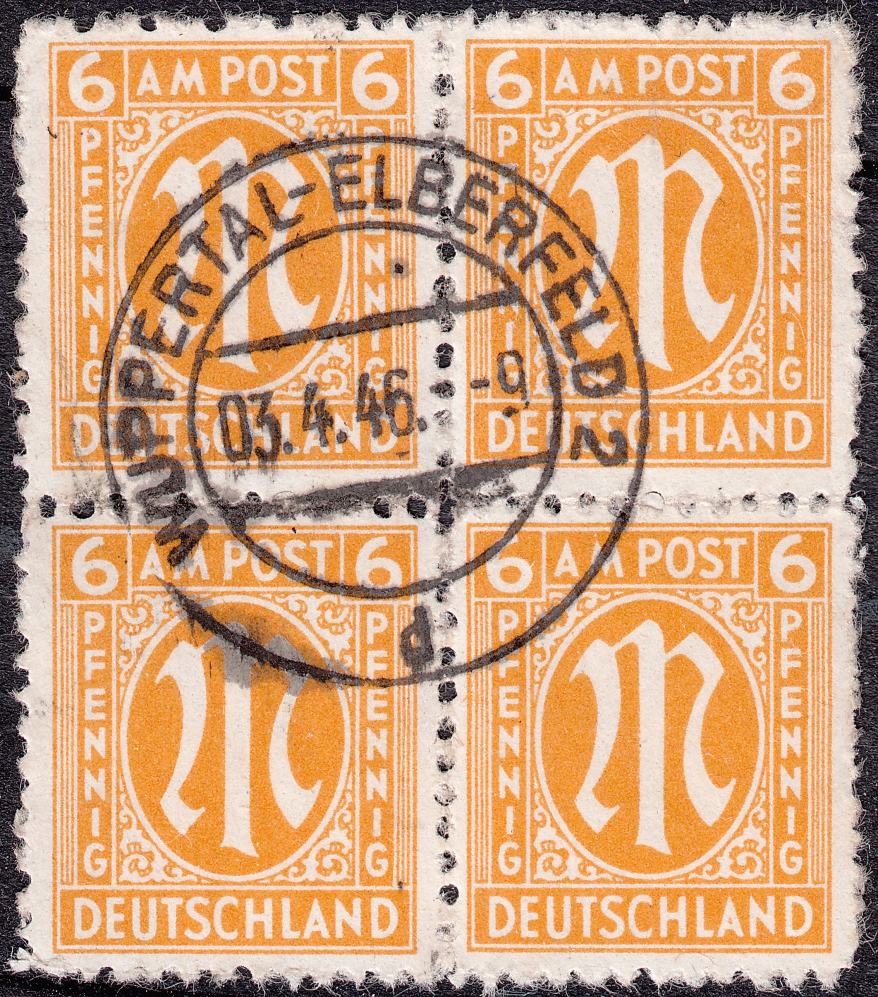 Der 6 Pf Wert der AM POST Serie im Viererblock, gestempelt am 03.04.1946 in WUPPERTAL-ELBERFELD 2: