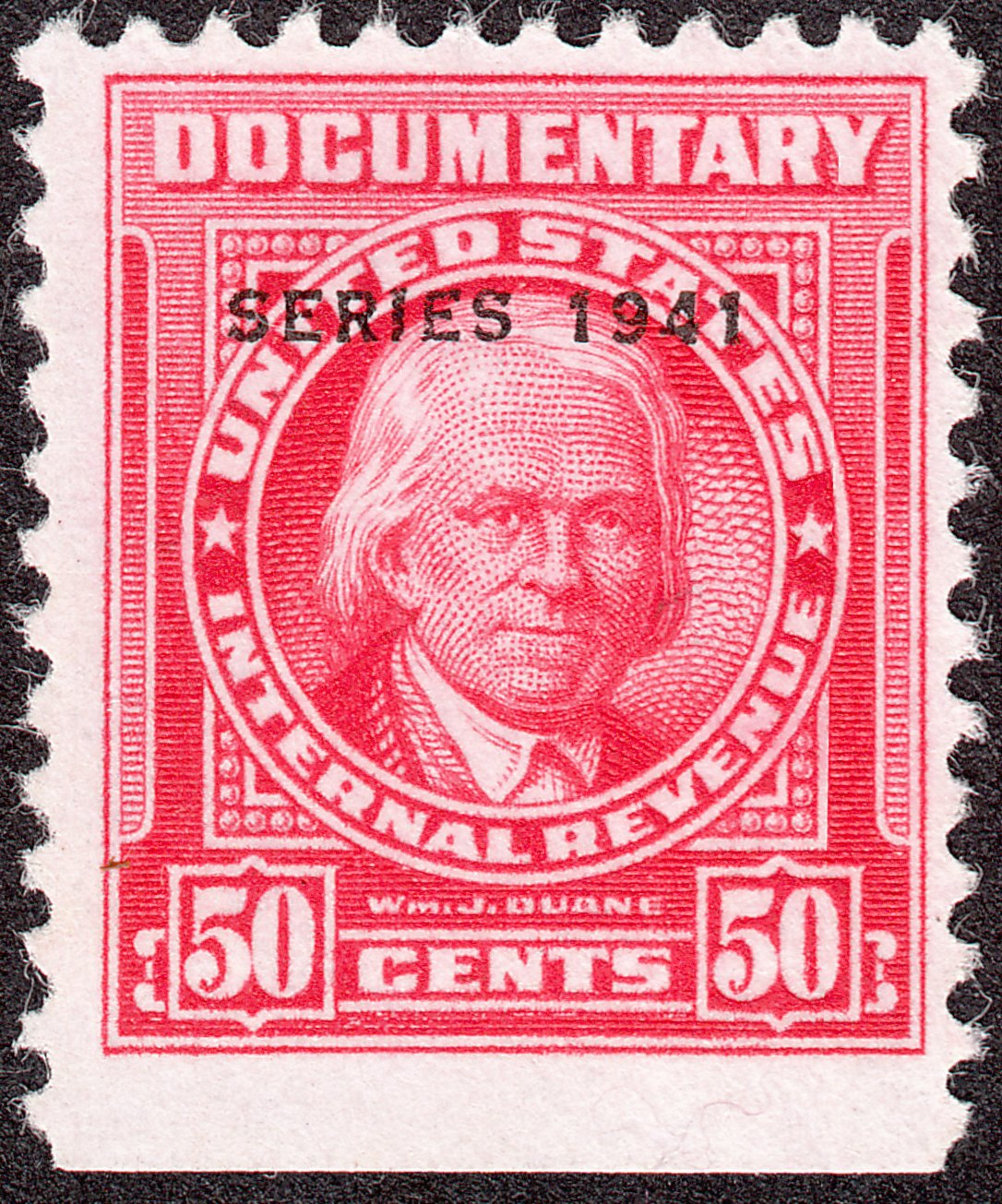 Die Wertstufe zu 50 Cents in karmin mit schwarzem Aufdruck "SERIES 1941" mit einem Porträt von William J. Duane katalogisiert Scott als "R321":