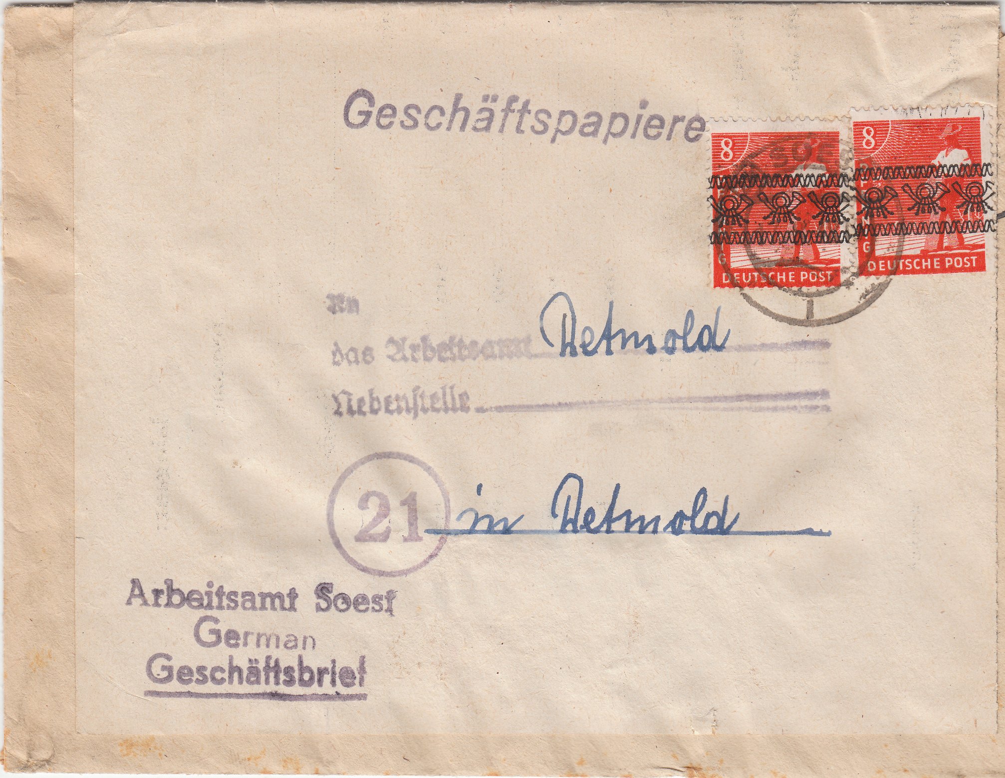 Bei diesem Beleg dürfte der Absender also wohl schlicht und einfach vergessen haben, eine zweite solche Marke zu 8 Pf zu verkleben, und die Post hat diese Unterfrankatur nicht bemerkt, denn sonst wären 12 Pf an Nachgebühr fällig geworden.