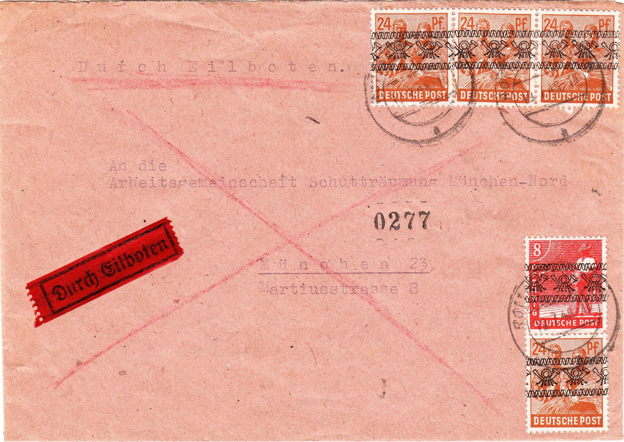 Die Portostufe 104 Pfennig für einen Brief im Fernverkehr (24 Pfennig) per Eilzustellung (80 Pfennig) konnte mit Marken der Posthörnchen Aufdrucke lediglich vom 21.06.1948 als Erstausgabetag dieser Marken bis zum 31.08.1948 als Letzttag dieser Portotarife dargestellt werden.
