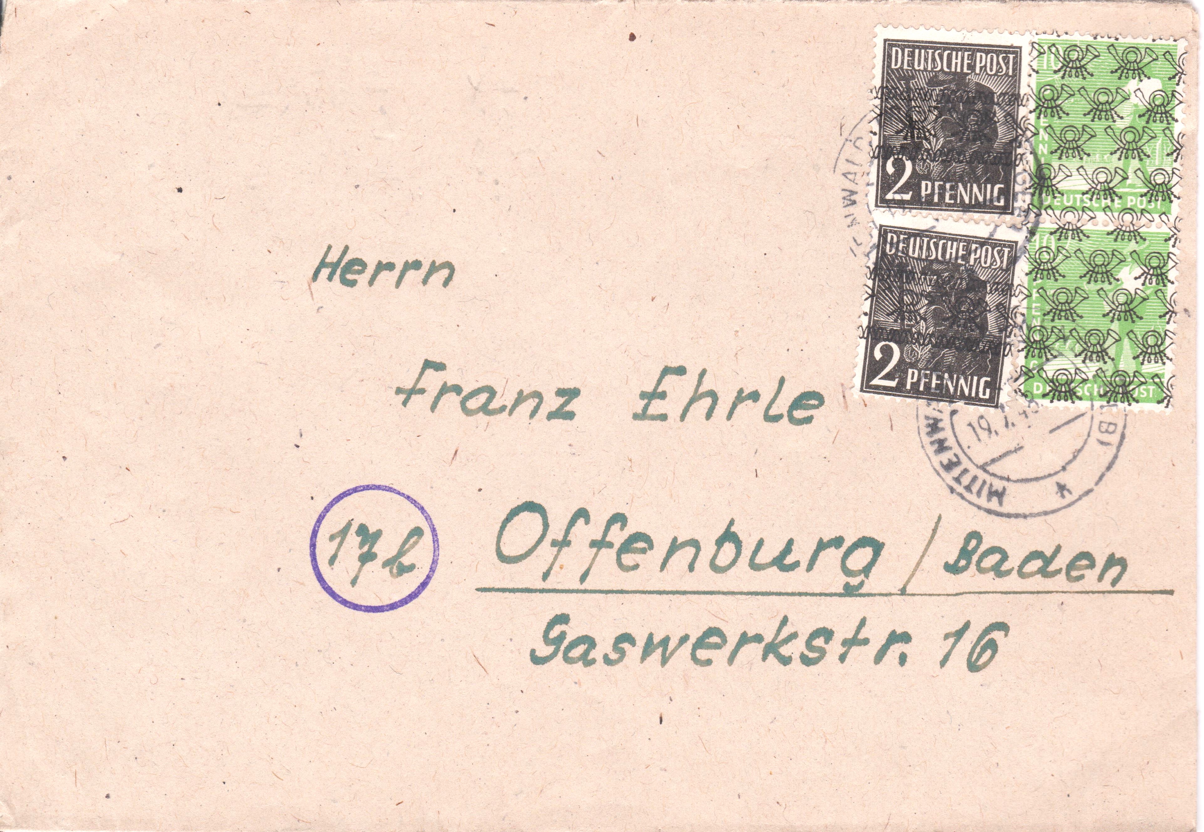Dort wurde der Umschlag ein zweites Mal verwendet, mit einem 16 Pf Wert der Arbeiterserie mit Netzaufdruck, MiNr. 42 II a, portogerecht frankiert und lief am 20.07.1948 im Ortsverkehr.