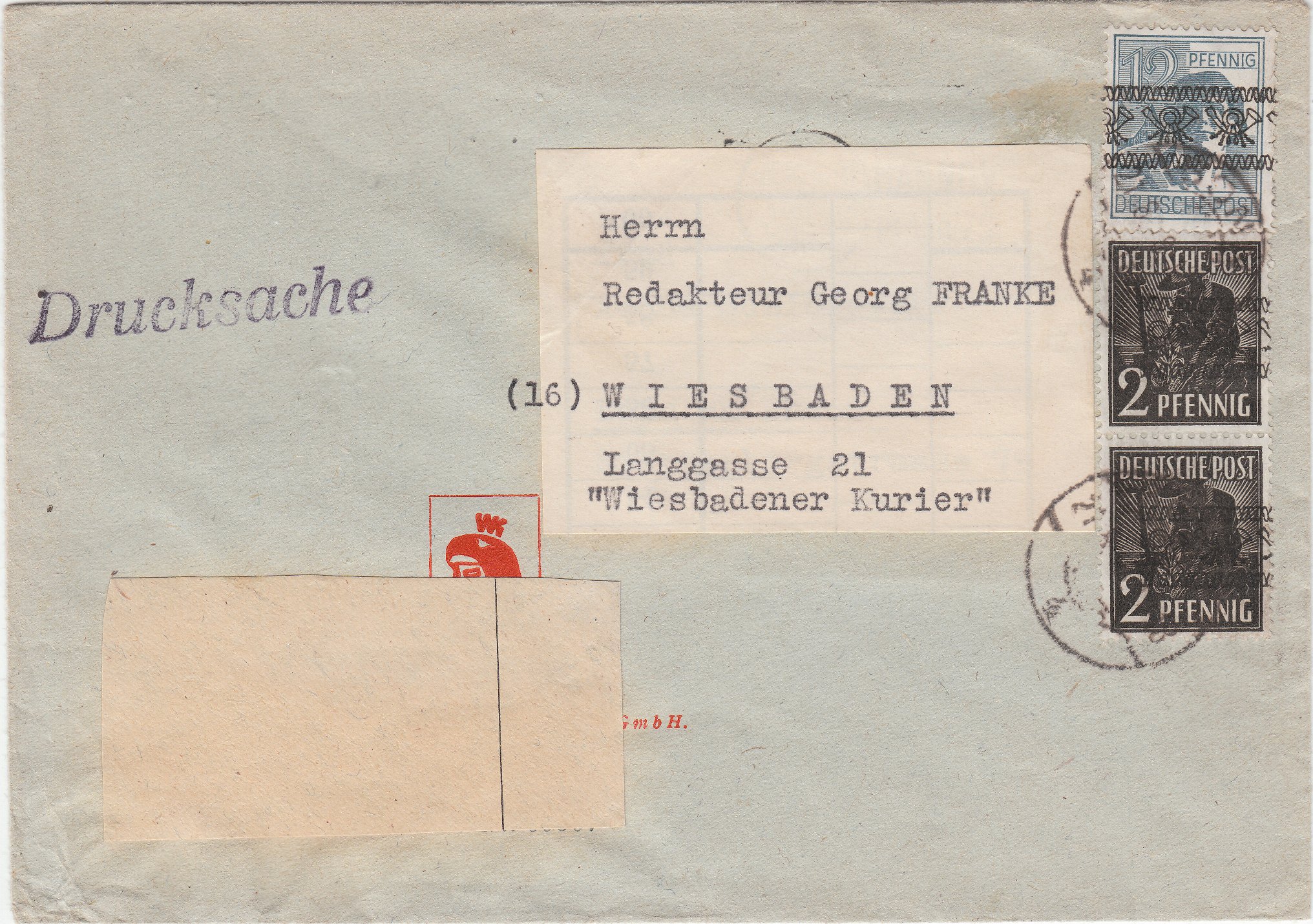 Senkrechter Zweierstreifen der MiNr. 36 I mit links nicht durchgehendem Bandaufdruck, also aus Reihe 1 am linken Bogenrand stammend, in Mischfrankatur mit einer MiNr. 40 I, am 21.08.1948 portorichtig auf Drucksache von 51 bis 100 g (16 Pf) von Bonn nach Wiesbaden: