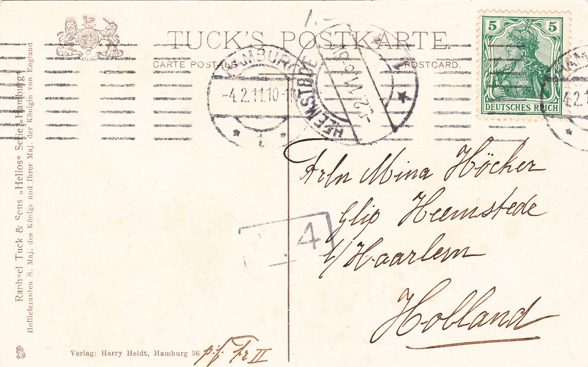In Holland wurde ein Zustellerstempel mit einer "4" abgeschlagen. Im Bestimmungsort "HEEMSTEDE", der eine Schlafstadt für die Berufspendler nach Haarlem ist, wurde am 05.02.1911 zu nachtschlafener Zeit, nämlich früh morgens zwischen 5 und 6 Uhr, ein Kreisbrückenstempel mit Bogen oben und unten als Ankunftsstempel abgeschlagen.