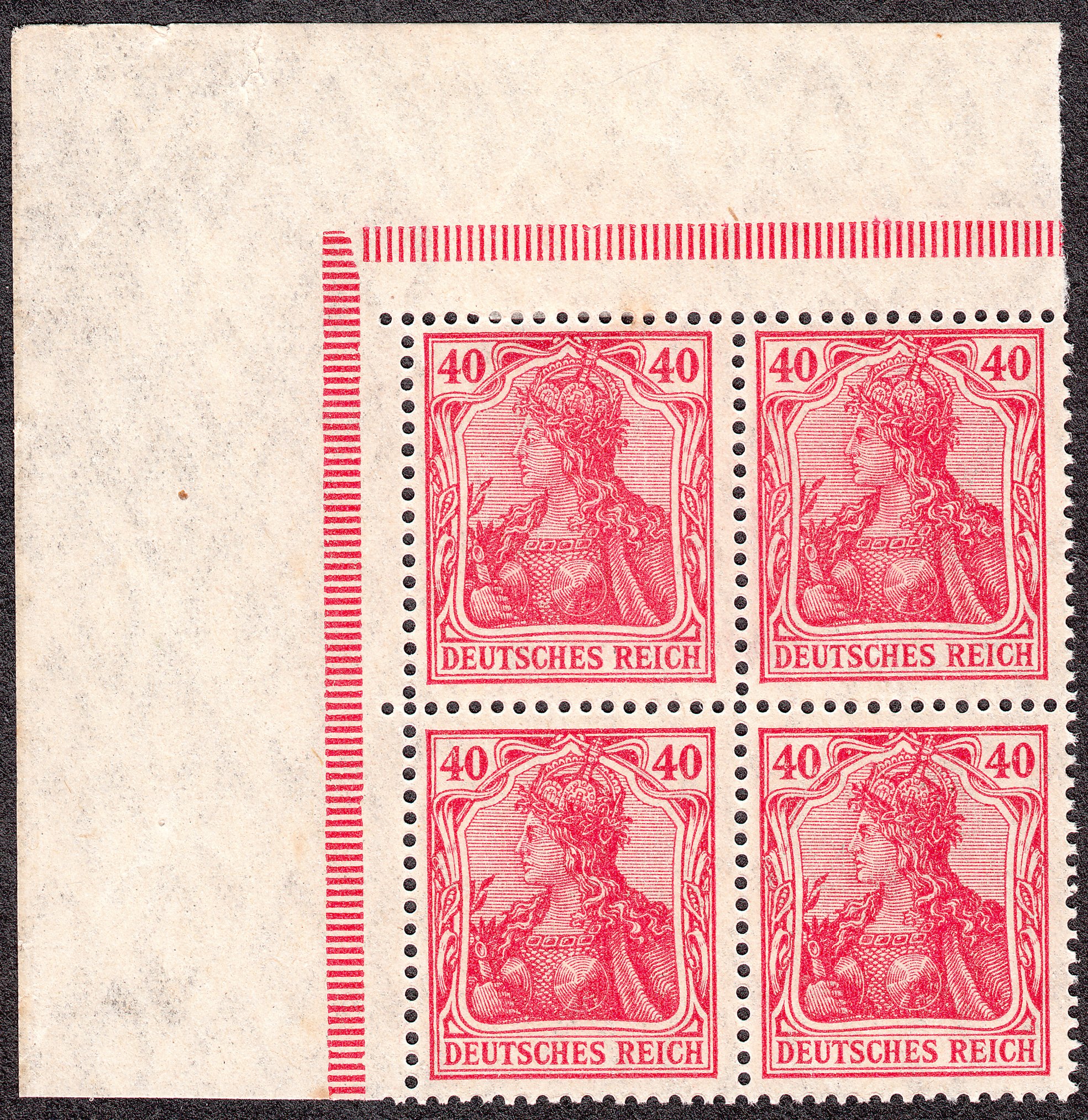 Postfrischer Viererblock vom Eckrand 1 der MiNr. 145 in Type II mit Strichelleisten am linken Bogenrand sowie am Oberrand, also aus MHB 1 für Heftchenblatt 28 stammend: