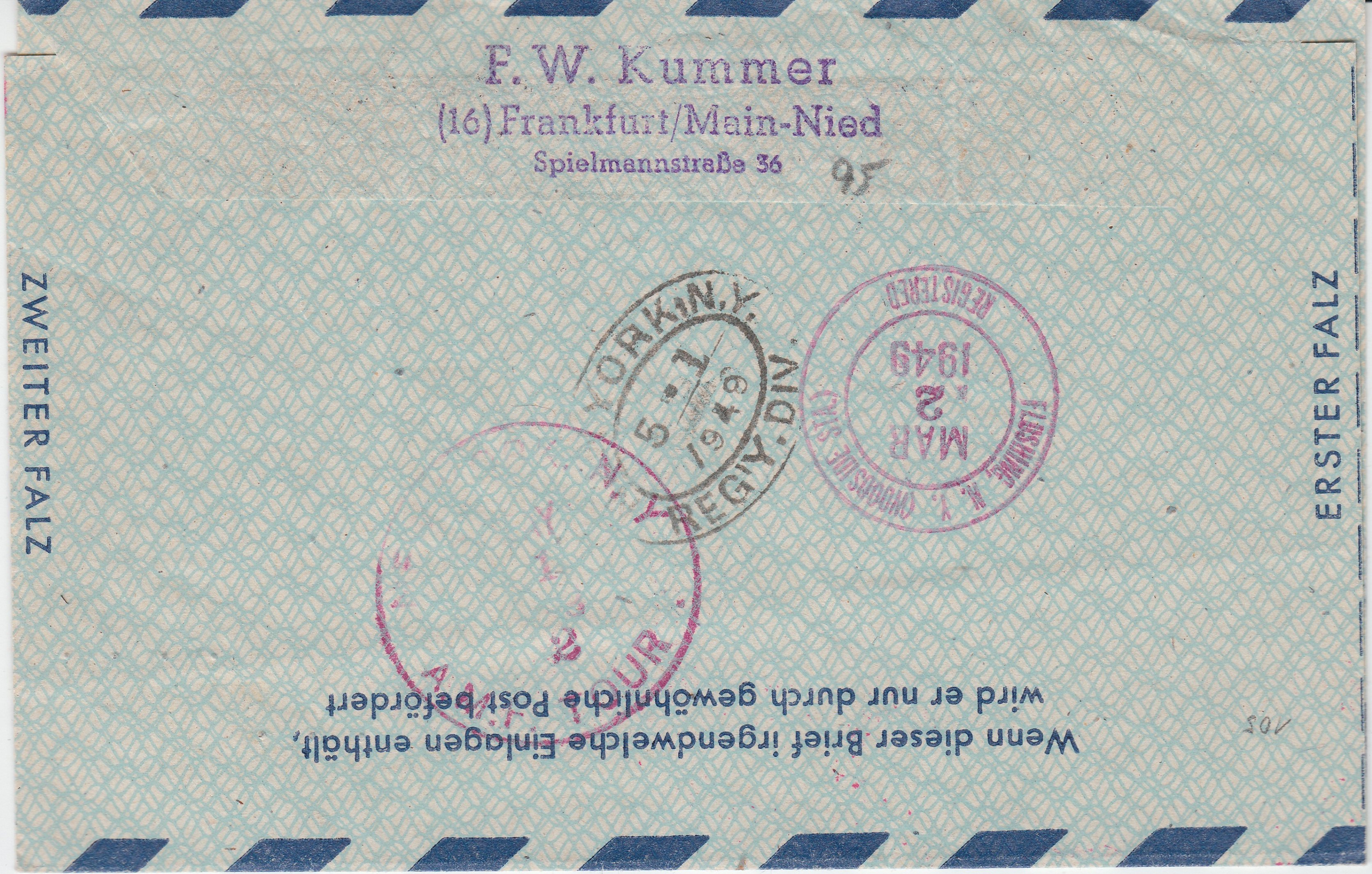 Der Zweiovalstempel in schwarz ''NEW YORK,N.Y. / REG'Y. DIV. / 5 . 1 / 1949'' dokumentiert den Eingang des Beleges in den USA am 01.05.1949.