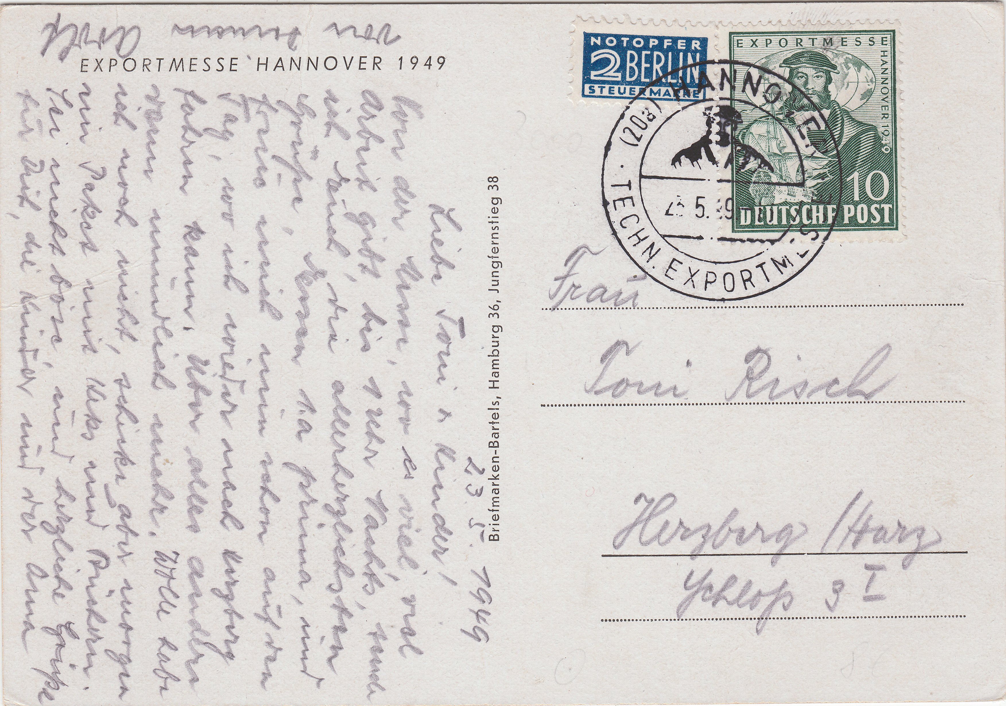 Die Notopfermarke wurde dann am 22.05.1949 entwertet per Handwerbestempel ''(20a) HANNOVER / TECHN. EXPORTMESSE / 22.5.49.-14''.