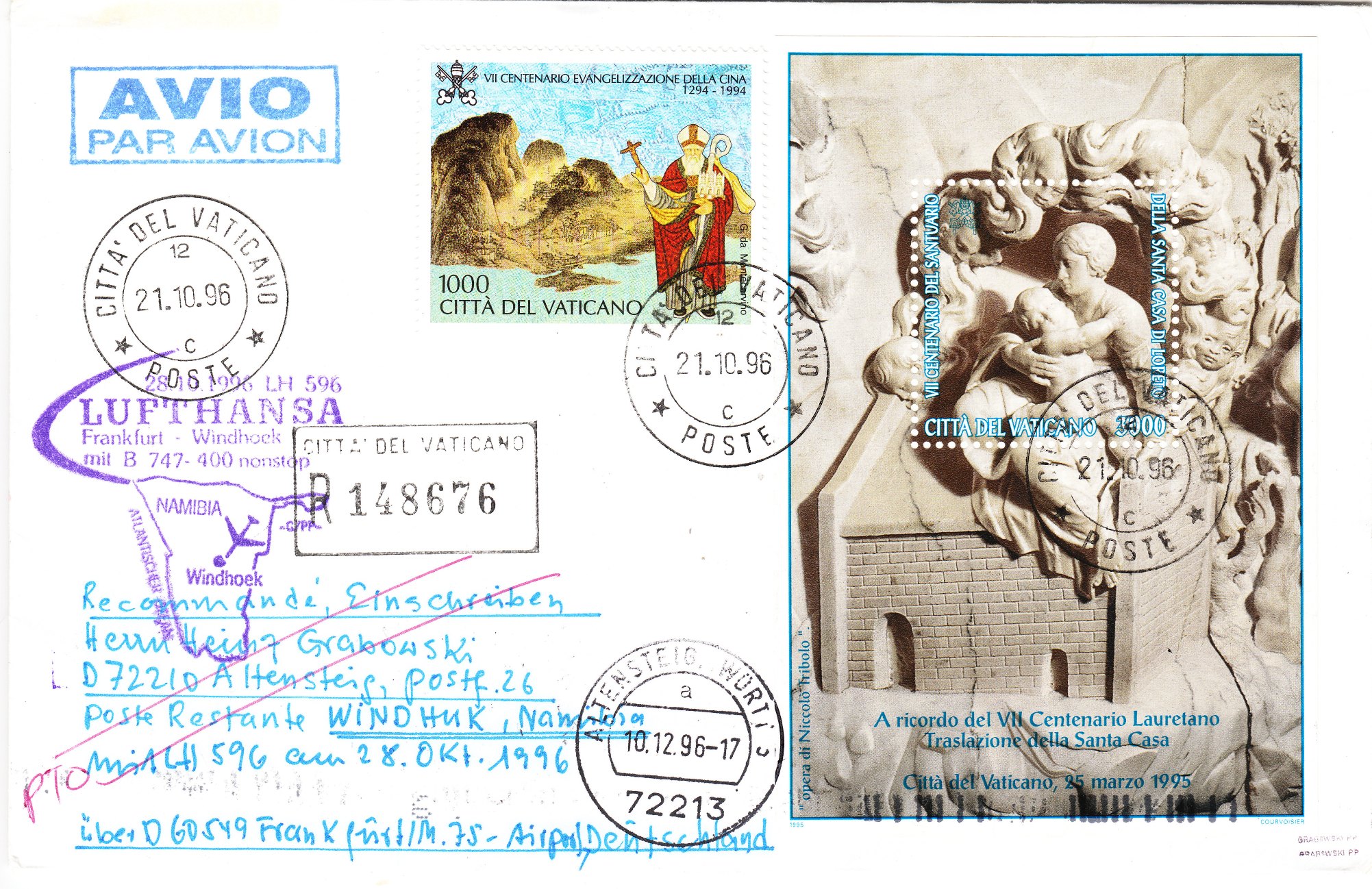 Und gleich noch ein weiteres Exemplar als Zuleitungspost ab Vatikanstaat, als Einschreiben mit der Einlieferungsnummer "148676" und ebenfalls mit der Blockfrankatur in Form einer Mischfrankatur: