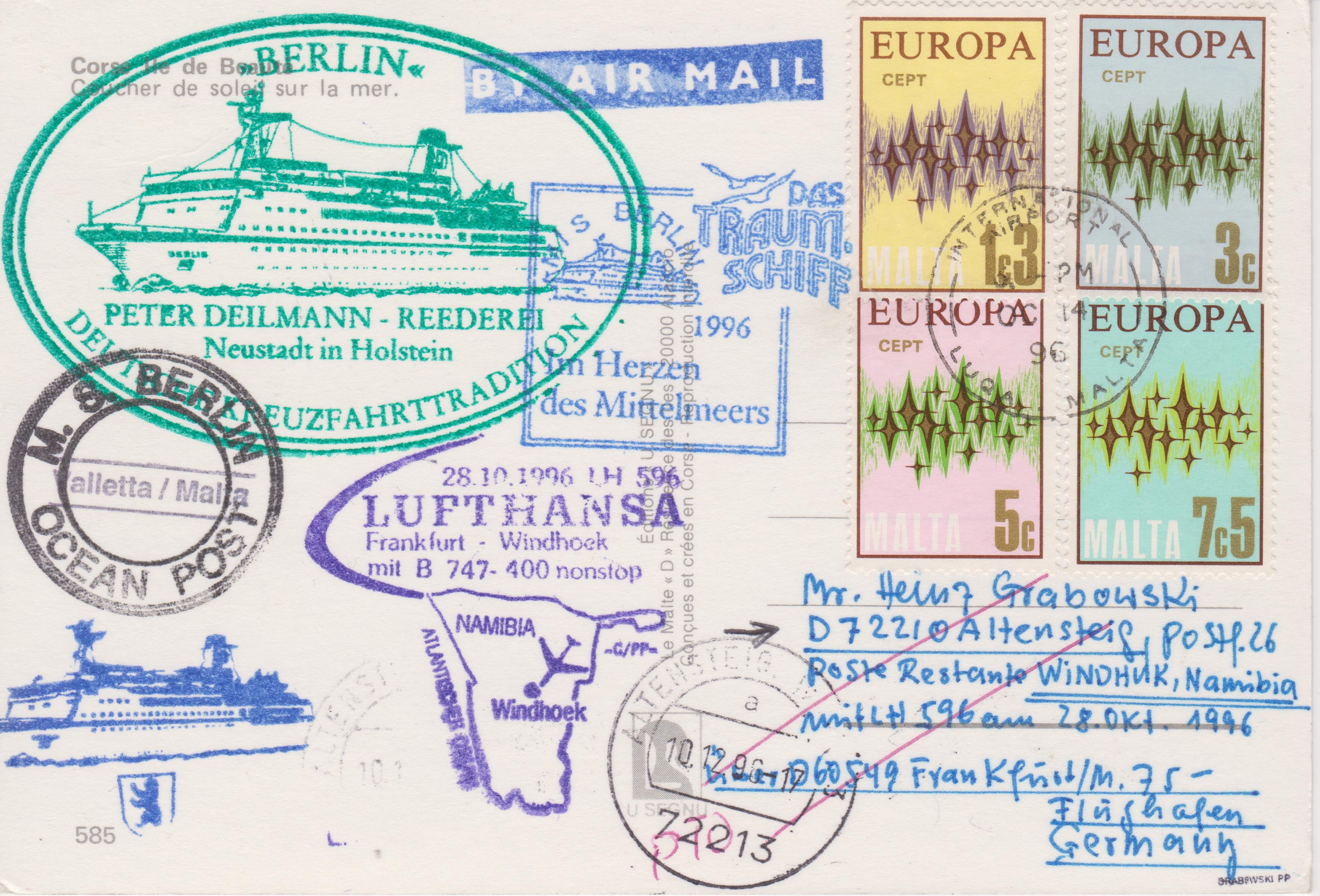 Hier der dritte von insgesamt 7 Belegen, die als Zuleitungspost von der MS BERLIN via Malta liefen: