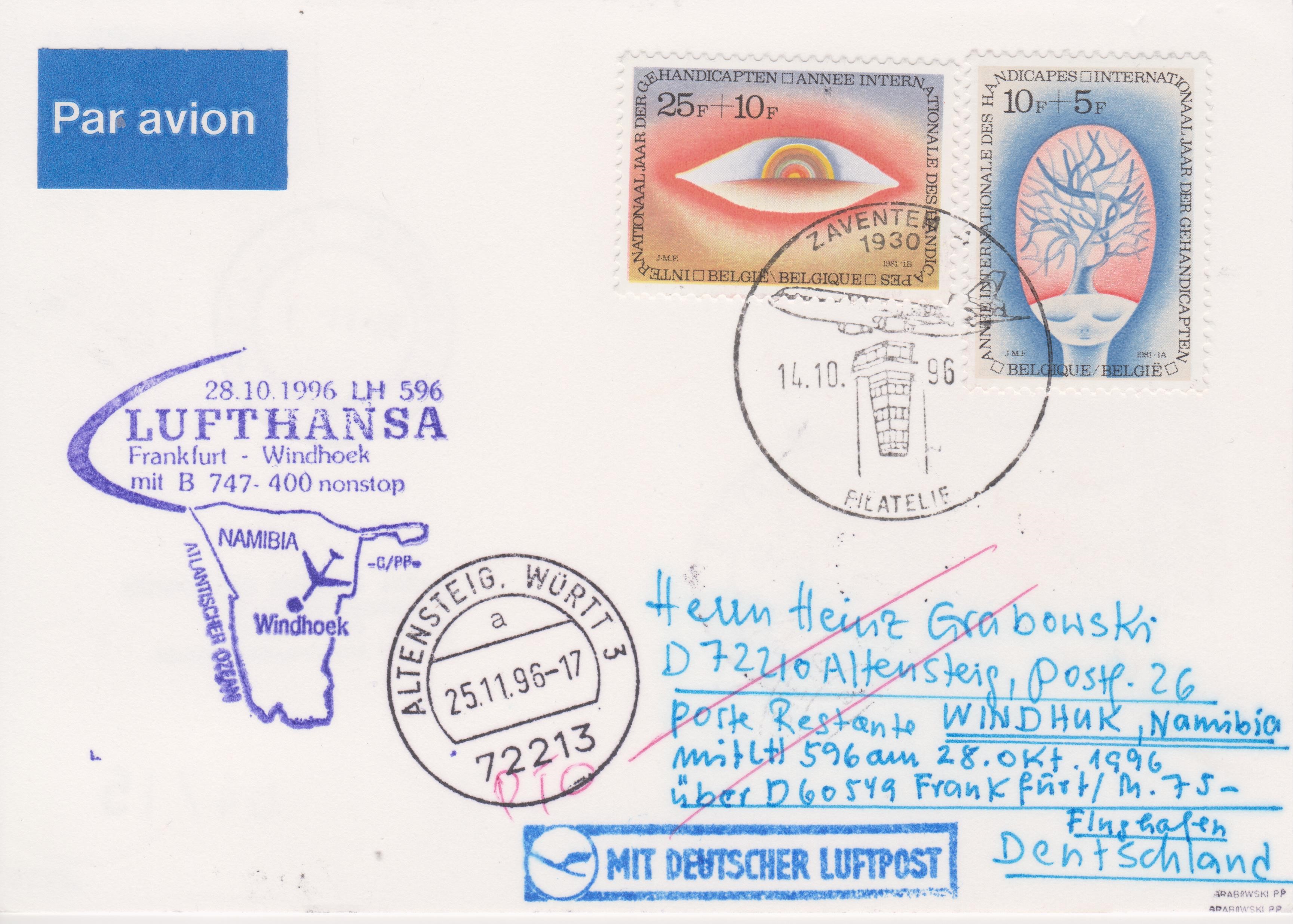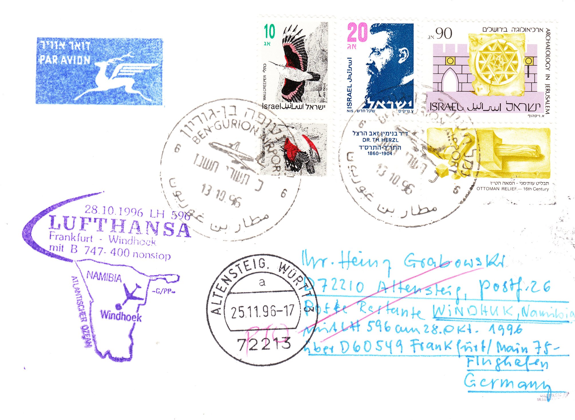 Dieser Beleg lief als Zuleitungspost ab Israel, aufgegeben am Ben Gurion-Flughafen von Tel Aviv, die Entwertung der Frankatur erfolgte am 13.10.1996 mit entsprechendem Stempel: