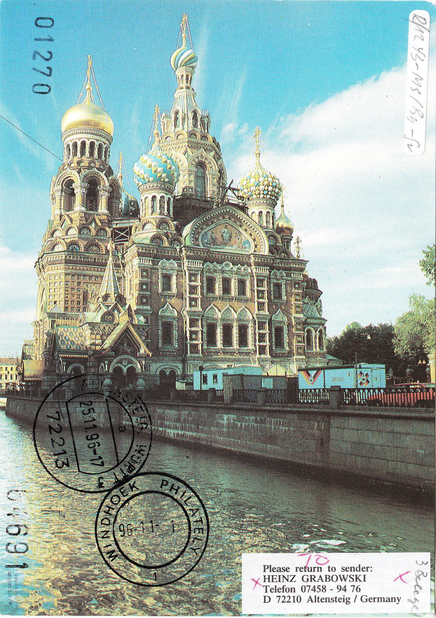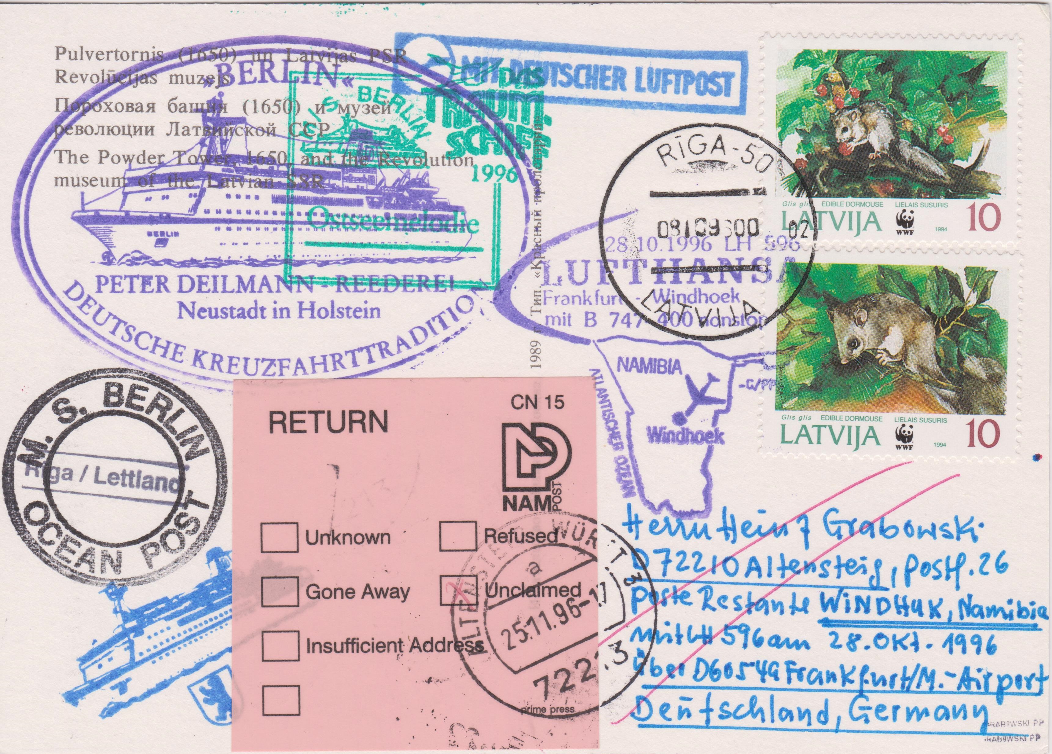 Der Beleg wurde dann am 08.10.1996 in Riga der Post übergeben und die Frankatur wurde entwertet.