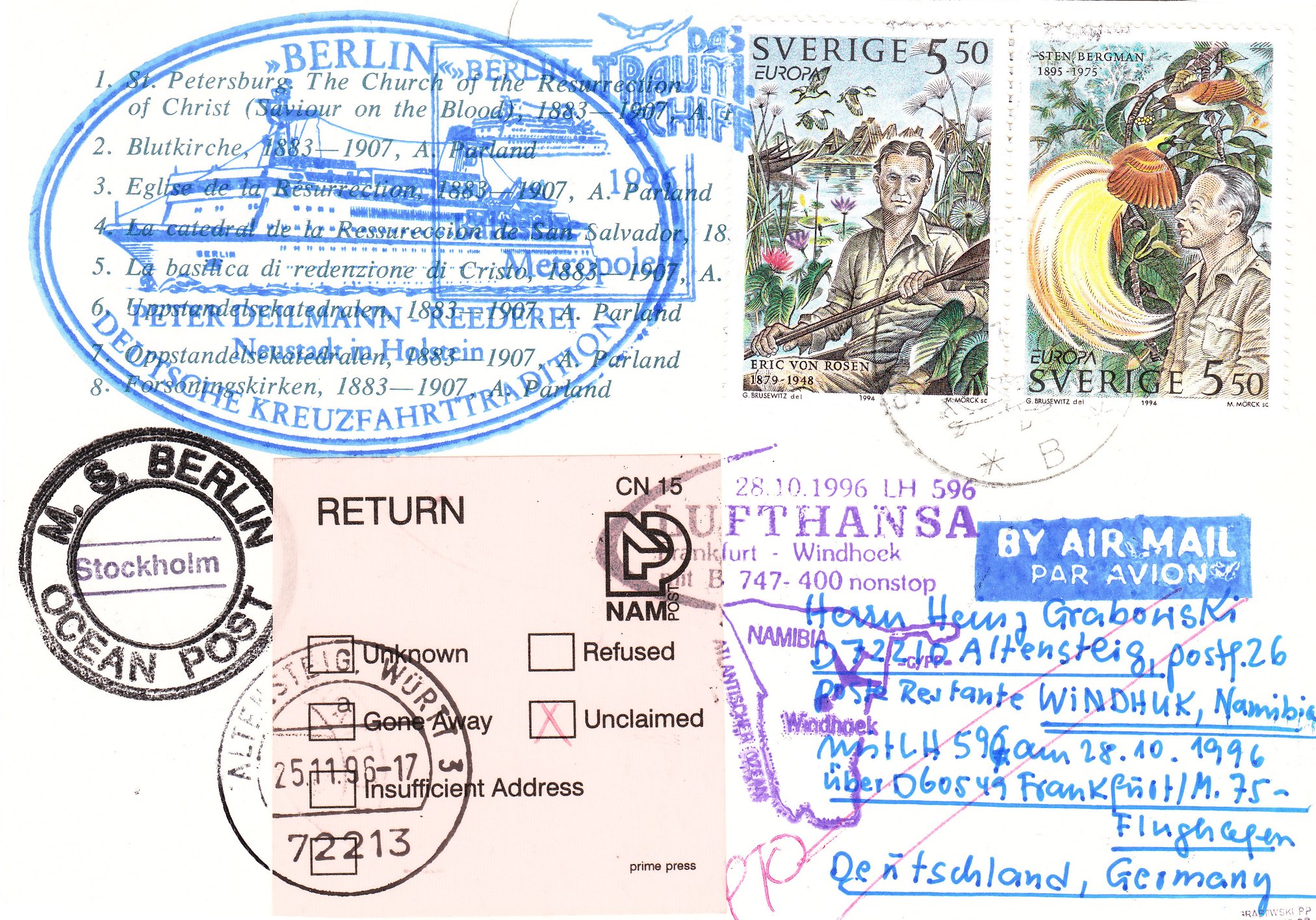 Im Unterschied zu dem zuvor gezeigten Beleg trägt dieser den Bordstempel der MS BERLIN in Grün statt in Schwarz. Zusätzlich wurde bei diesem Exemplar ein weiterer Bordstempel in Blau abgeschlagen. Beim Empfänger kam der Beleg dann am 25.11.1996 an.