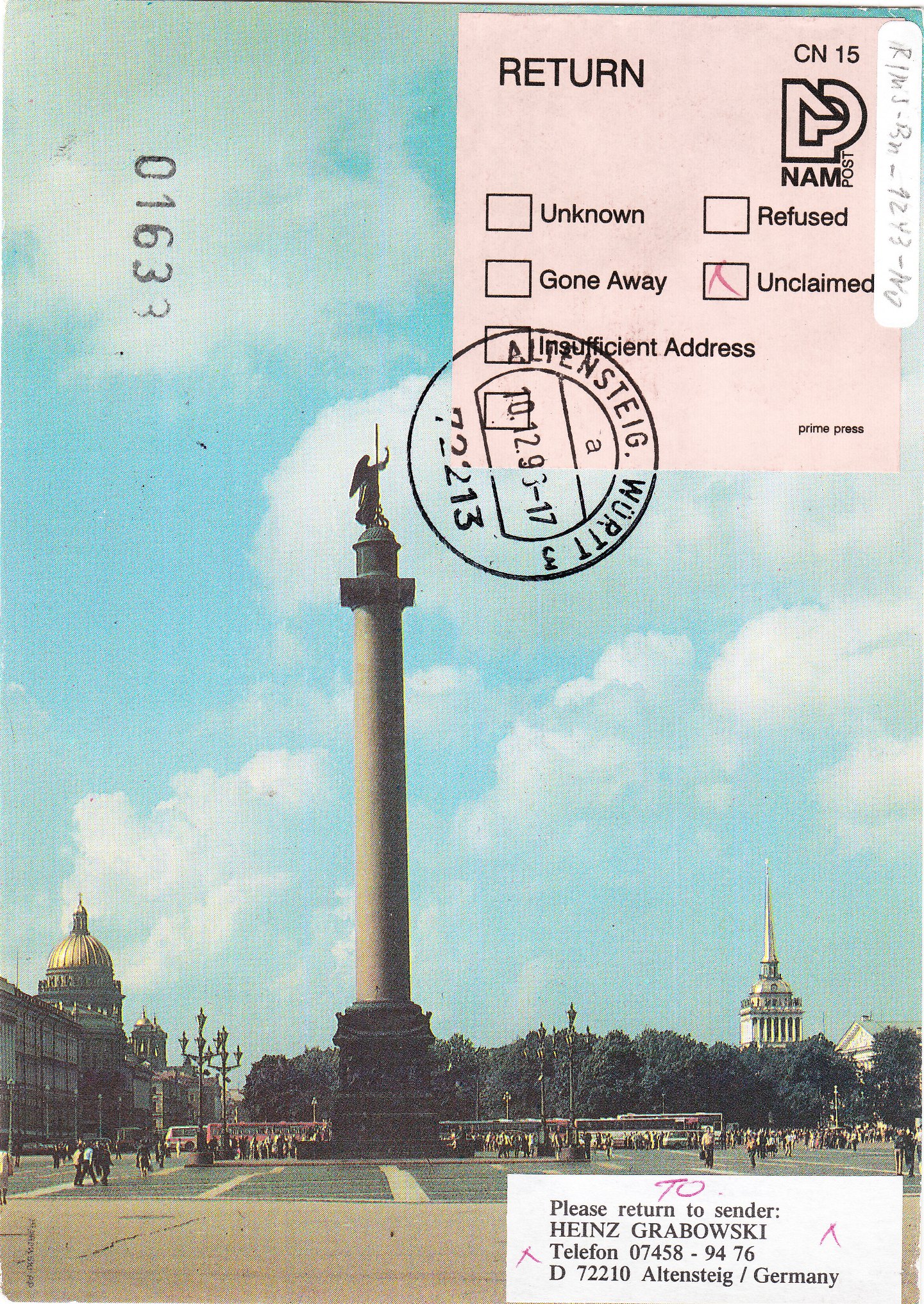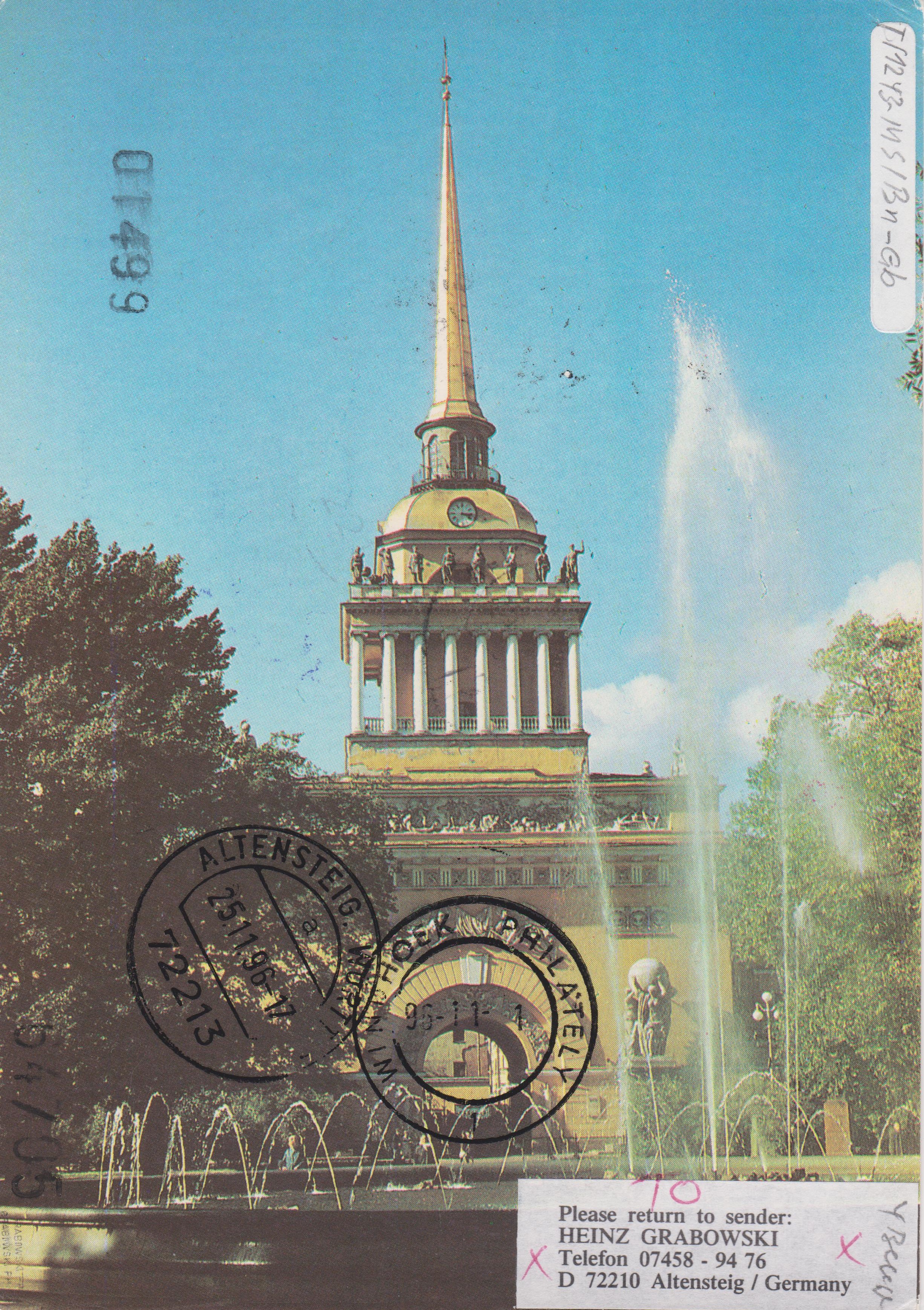 Dieser Beleg, eine Ansichtskarte aus St. Petersburg, wurde als Zuleitungspost an Bord des Kreuzfahrtschiffes MS BERLIN aufgegeben und trägt daher den Bordstempel des Schiffes in Blau: