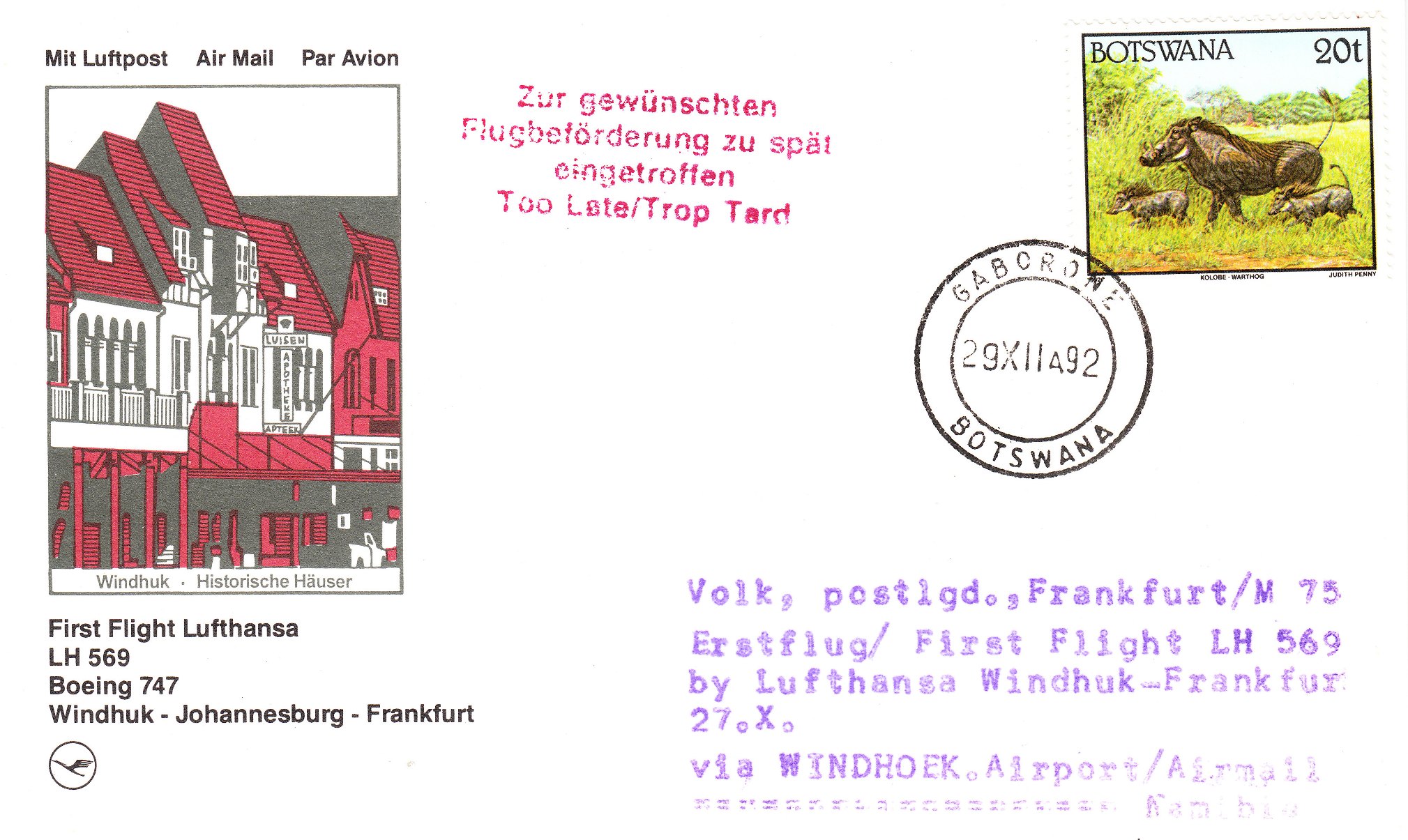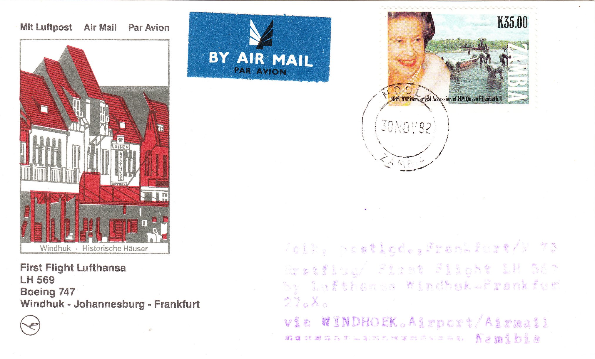 Nach dem Motto "Wer zu spät kommt, den bestraft das Leben" kam dieser am 30.11.1992 in NDOLA, der zweitgrößten Stadt in Sambia = Zambia aufgegebene Beleg, der als Zuleitungspost zum Erstflug LH 569 gedacht war, zur Beförderung auf diesem Erstflug somit deutlich zu spät und wurde daher ohne weitere Kennzeichnung per ganz normaler Luftpost von Windhuk nach Frankfurt abgeleitet: