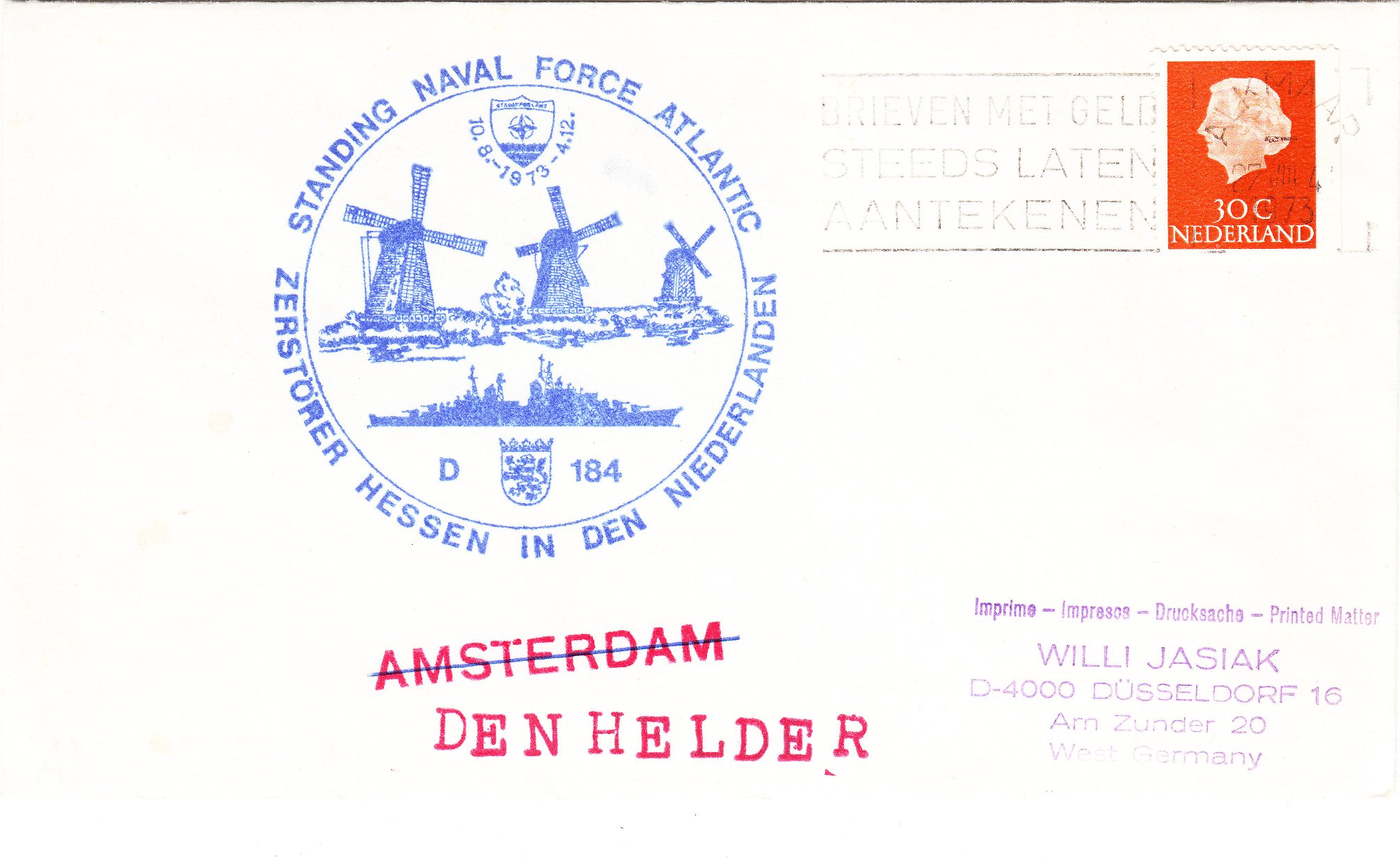 Vom 10.08.1973 bis zum 04.12.1973 gehörte der Zerstörer HESSEN zur STANAVFORLANT = STANDING NAVAL FORCE ATLANTIC und lief während dieser Zeit Häfen in den Niederlanden an, worauf der Cachetstempel dieses Beleges hinweist: