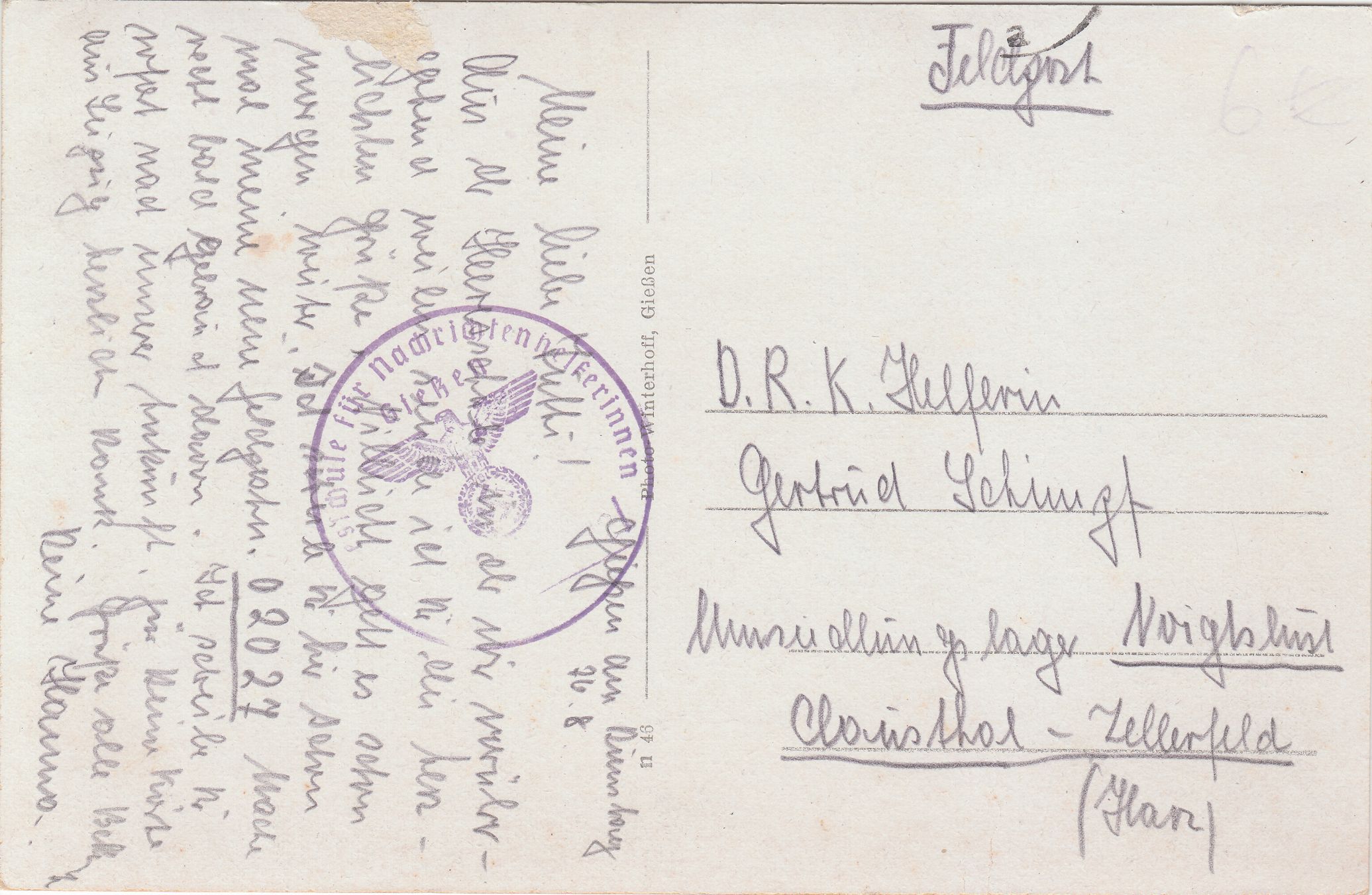 Die Portofreiheit als Feldpostsendung wird bestätigt durch einen Truppenstempel "Heeresschule für Nachrichtenhelferinnen Gießen".
