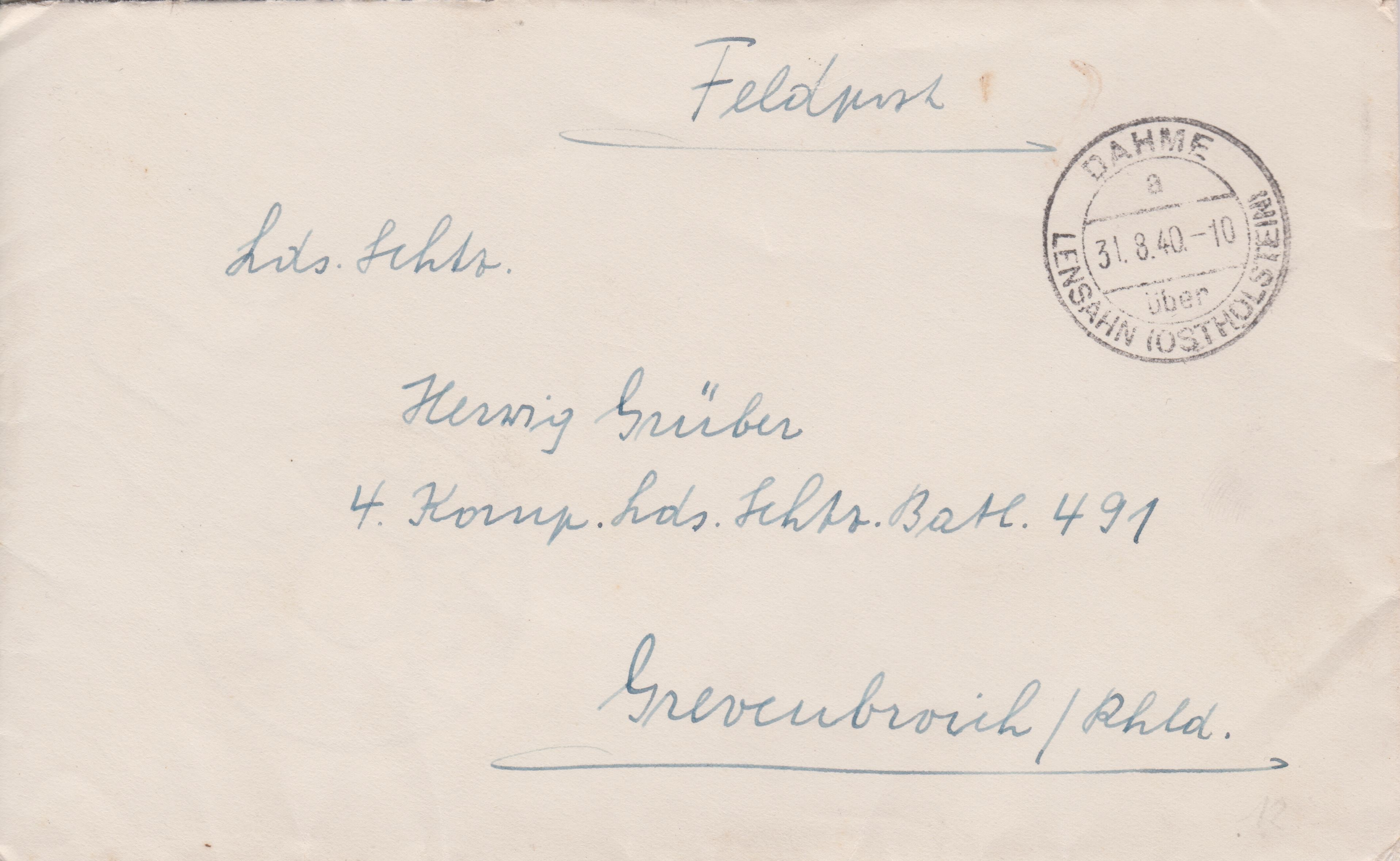 Portofreier Feldpostbrief, aufgegeben am 31.08.1940 in DAHME über LENSAHN (OSTHOLSTEIN), adressiert "4. Komp. Lds. Schtz.Batl. 491 Grevenbroich/Rhld.":
