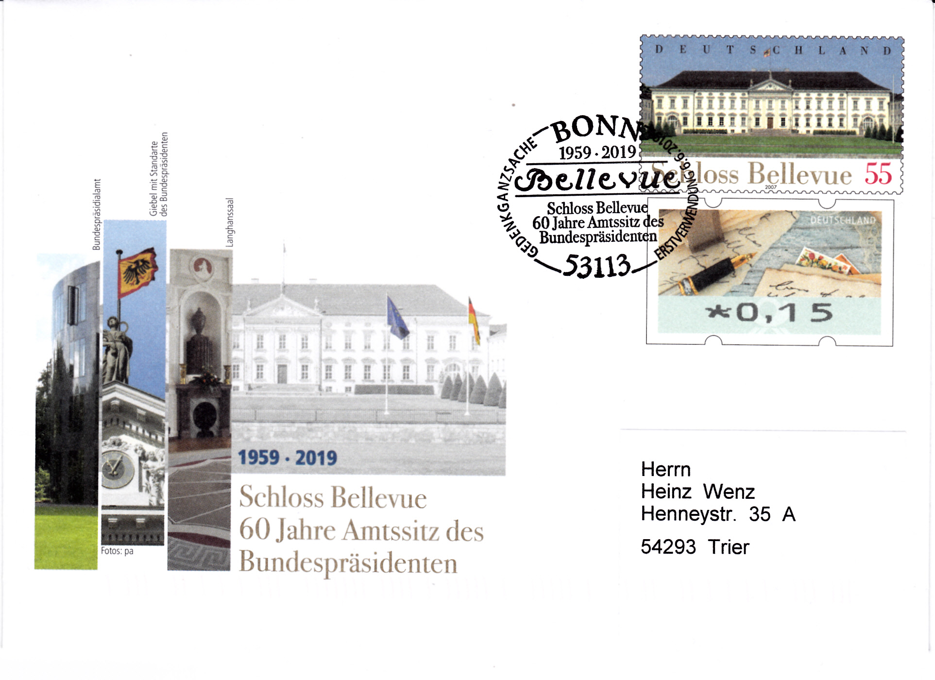 Zu dieser Gedenkganzsache gab es auch einen Erstverwendungsstempel aus Bonn. Hier ein gelaufener Beleg mit diesem Stempel: