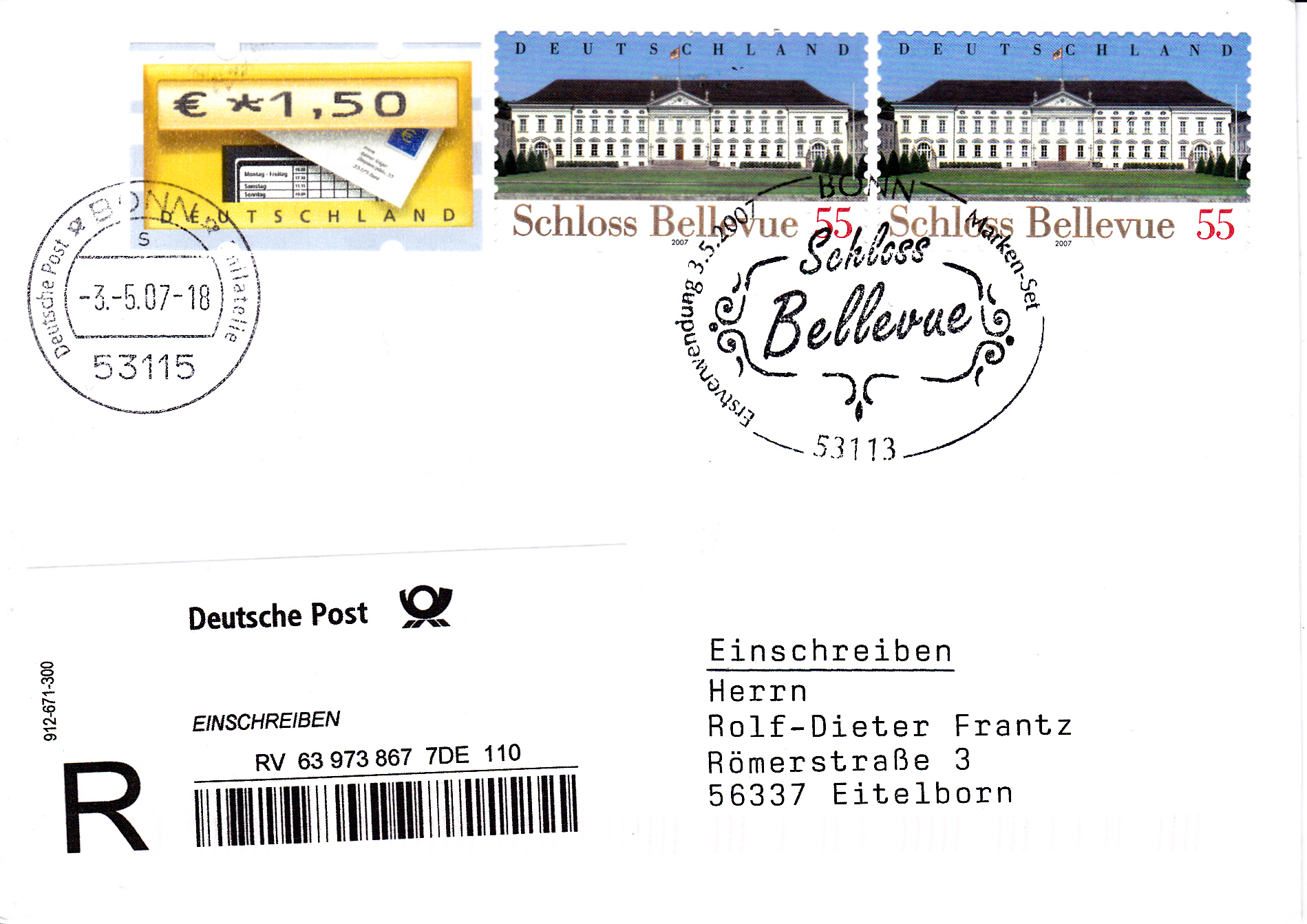 Einschreibe-Brief mit zwei Marken "Schloss Bellevue - Amtssitz des Bundespräsidenten" (MiNr 2601) und einer Automatenmarke zu 1,50€. Die beiden Marken "Schloss Bellevue" wurdne mit dem Ersttagsonderstempel Bonn entwertet, die Automatenmarke mit einem Tagesstempel. Das Porto berechnet so: Brief bis 20 Gramm 55 Cent , die Zusatzleistung Einschreiben 205 Cent, zusammen also 260 Cent.